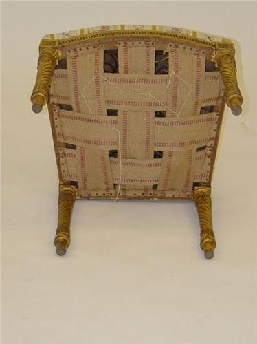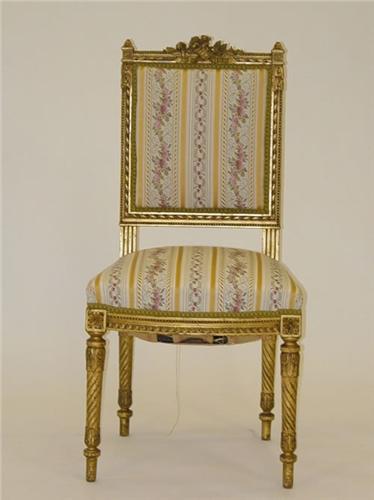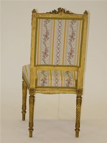 LOUIS XVI STYLE GILT WOOD CHAISE SIDE CHAIR W/ BOWED SEAT, BEADED & CHANNELED FRAME W/ ACANTHUS & FLORAL CARVINGS & GARLAND W/ BASKET OF FLOWERS CARVED CREST & SQUARE PADDED BACK (37 1/2" T X 19" W X 18" D) - WEAR & IMPERFECTIONS