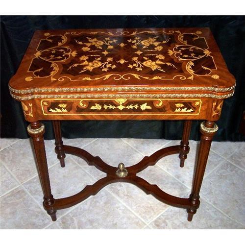 An extremely unique and unusual piece, this Louis XV style gaming table is beautifully inlaid with exotic woods in a multitude of complex and intricate designs. Expertly hand crafted in solid mahogany and accented with solid brass Ormolu trim, this fabulous gaming table features a playing area inset with subtle high quality leather in a traditional green with an embossed, hand tooled edge design in gold leaf. When open, the playing surface measures approximately 33 3/4" X 27 1/2". Hidden inside this exquisite piece, is a generously proportioned area perfect for the storage of cards, chips, chess pieces, etc. This truly magnificent one-of-a-kind piece is a perfect addition to any decor and will surely garner its fair share of envious stares. CLASSIC PERIOD GAMING TABLES SUCH AS THIS ARE VERY RARELY AVAILABLE IN THE MARKETPLACE. SPECIAL SHIPPING OFFER: Standard Ground Shipping on this piece to anywhere within the continental United States is $1.00!!