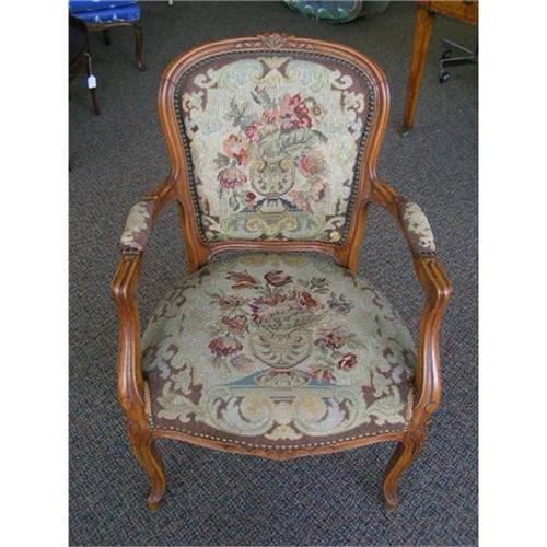 THIS LOUIS XVI STYLE CHAIR IS BELIEVED TO BE A FRUITWOOD. IT HAS A PECAN COLORED STAIN OVER THE ORNATELY CARVED LEGS. THERE IS MINOR WEAR TO THE NEEDLEPOINT ON THE ARMRESTS AS WOULD BE EXPECTED ON A CHAIR OF THIS AGE. THE SEAT AND BACK ARE IN EXCELLENT CONDITION.