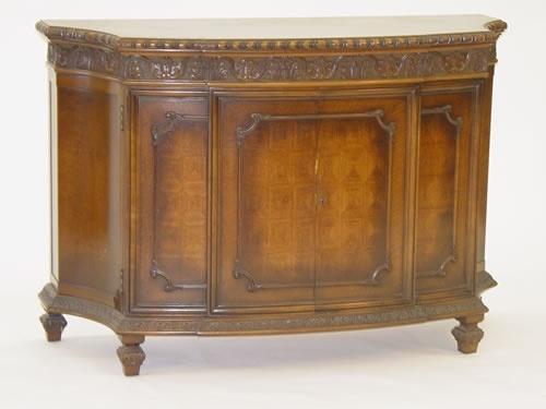 LOUIS XVI STYLE WALNUT & PARQUETRY D-SHAPED SIDE CABINET CREDENZA W/ 4 DRAWERS BEHIND 2 DOORS-SHAPED TOP, CARVED FRIEZE & BASE MOLDING W/ STIPPLED BACKGROUND & CARVED & TAPERED FEET (33" T X 46" W X 19" D) - LOSSES & IMPERFECTIONS