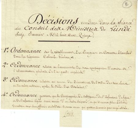 (1755 - 1824) King of France in the restoration of the Bourbons following the fall and exile of Napoleon. Manuscript D.S. "Louis" as King, 1p. oblong 4to., [n.p.], Jan. 16, 1815 in French concerning several military ordinances. Document unusually but neatly trimmed at bottom margin, else fine.