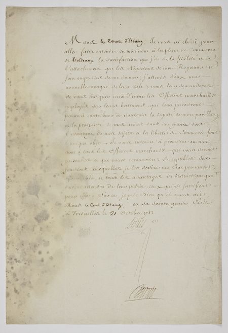 (1754 - 1793) King of France whose ambivalent policies cost him the support of Royalists and Revolutionaries, put under house arrest after his attempt to flee France, condemned by a tribunal for treason and guillotined with his wife Marie Antoinette. Louis was a strong supporter of the colonists' efforts to gain independence, providing troops, naval forces, and financial support. Fine content and superb association war-date manuscript L.S. with secretarial signature but approved by Louis "Connu" ["Understood"] at bottom,1p. folio, Versailles, Oct. 20, 1782, in French to Charles Hector, Count d'Estaing (1729-1794), the French admiral in the American Revolution who commanded a fleet of 31 vessels under the ultimate command of George Washington. In part: "...I have chosen you to go to the Place de Commerce in Bordeaux where you are to make known, in my name, how much I am satisfied with the loyalty and devotion which the merchants of my Kingdom have so eagerly shown me; I expect a new mark of their zeal; You will ask them to indicate to you those Merchant Marine Officers employed on their ships whom they believe to be suitable to contribute to the upholding of the dignity of my naval flag and the prosperity of my armies in a war whose sole object is the advantage of my subjects and freedom of trade. To all those Merchant Marine Officers who will be presented to you and whom you will consider suitable for the functions which I will reserve for them, I authorize you to promise, in my name, a permanent commission accompanied by all the advantages and distinctions which all those who sacrifice themselves for their country have a right to expect...". The document's association with the Merchant Marine is historically important: before his dethroning and execution, Louis XVI began successful expansion of France's navy and merchant marine; the government of the French Revolution would use these assets to increase France's coffers through trade, slaving, capturing enemy vessels, and other lucrative eighteenth-century maritime practices. Light toning throughout with moderate soiling and foxing along the left margin and small archivally-repaired tear at lower right, none affecting signature.