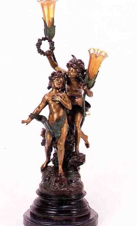 "LOVE SONG" BRONZE SCULPTURE LAMP - AFTER A. MOREAU - BEAUTIFUL COLOR PATINA - MOUNTED ON A FINE ITALIAN MARBLE BASE - BEAUTIFULLY DETAILED - SIGNED - MINT CONDITION - 33"H X 11"W - LOST WAX CAST BRONZE