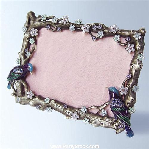 Hues of blues and bronzes. This gorgeous, Pewter Picture Frame has been hand enameled, then set with genuine, sparkling, Swarovski Crystals. Two blue love birds grace the bottom corners.