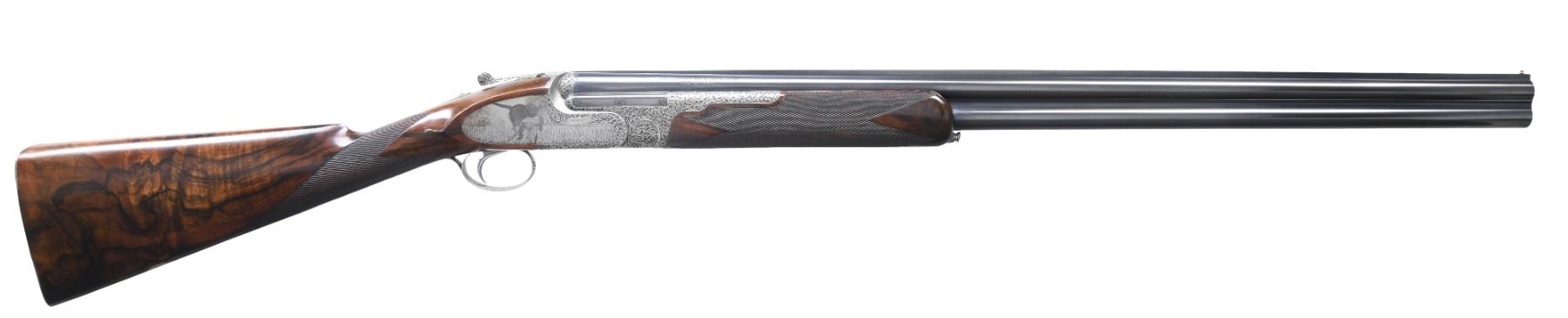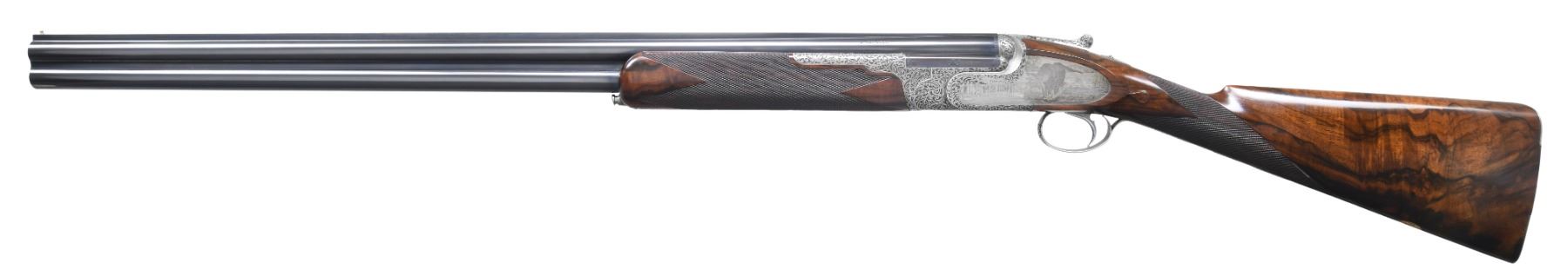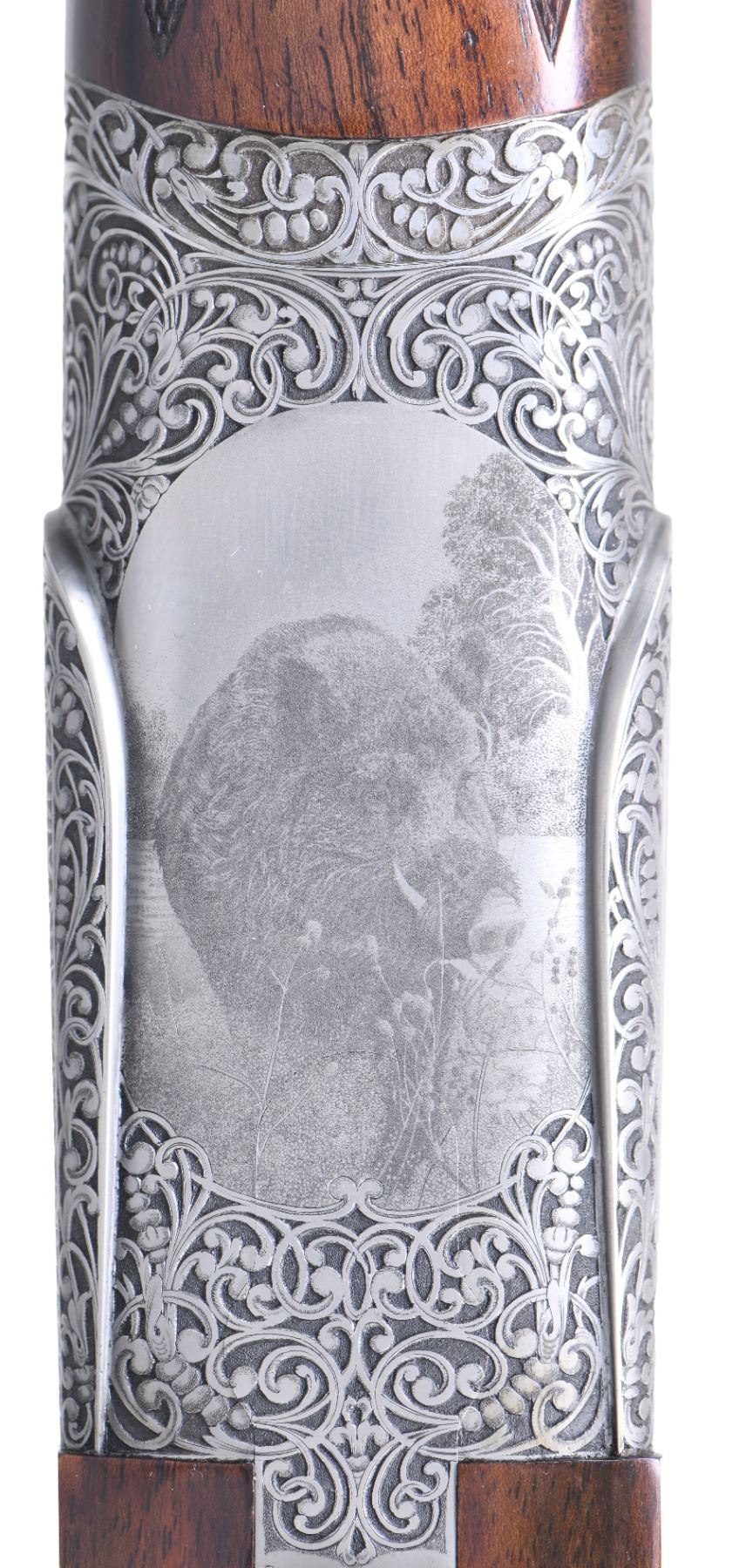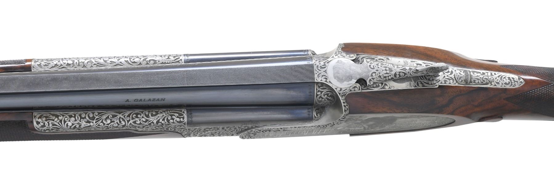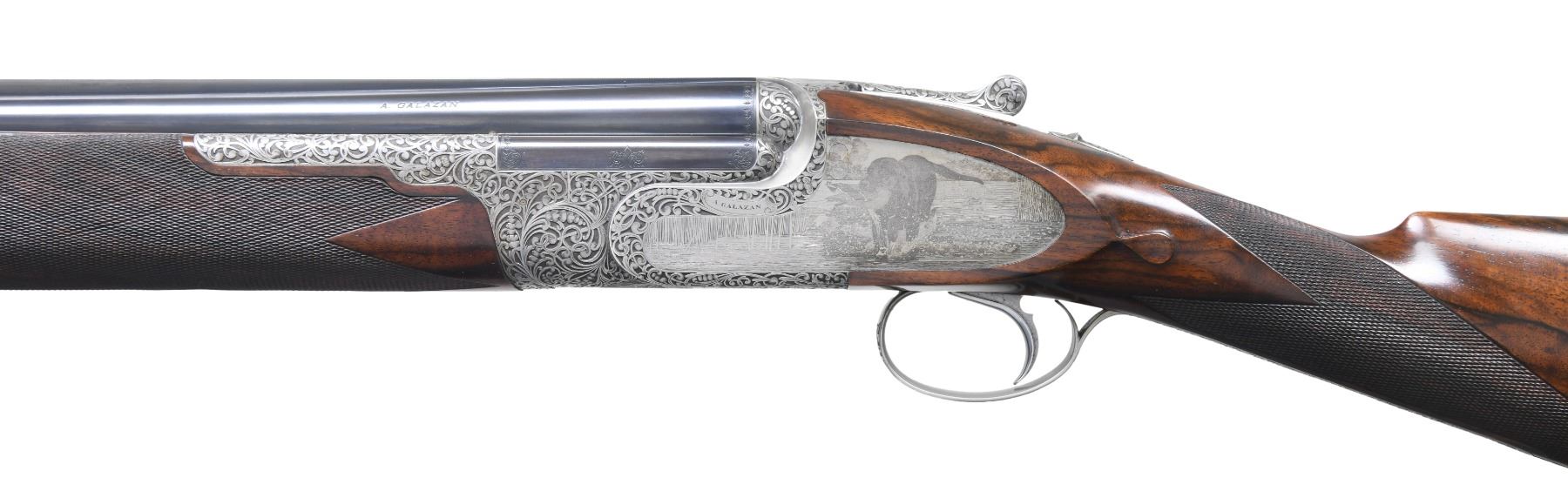 SCROLL & BULINO WORK BY GIANCARLO & STEFANO PEDRETTI. Cal. 12 Ga. S# G123. The 30" demi-block barrels are fitted with flat matted solid rib. Left side of top barrel is marked "A. GALAZAN" and right side is marked with Connecticut Shotgun name and address. Barrel flat is marked with S# and caliber information. Coin finished completely pinless low profile Boss style O/U action is fitted with non-automatic safety ("SAFE" inlaid in gold) and single non-selective trigger. Action is engraved with full coverage truly exceptional large open scroll with beaded highlights which is beautifully shaded. On bottom of action is an intricately detailed Bulino scene of wild hog or Russian boar standing in open field with sprigs of grass in foreground and dramatic woods behind. Lockplates are completely engraved with Bulino scenes of a black lab. On left lockplate he is retrieving a mallard from a cattail swamp. On right side he is retrieving a ring neck pheasant from a cut-over corn field. Top lever pivot is engraved with a portrait of this dog and a mallards head is exposed when the gun is opened. Backgrounds are also amazingly detailed. This fine work is by the well known father and son team Giancarlo & Stefano Pedretti whose signature appears on trigger plate and lower left of duck scene. The fine relief scroll continues on to single beaded trigger guard bow and tang which has S# inlaid in gold. Straight grip buttstock is made of a fine piece of stump figured and well marbled European walnut and measures 14-5/8" over checkered wood butt with engraved steel heel and toe plates. Stock features drop points, well cut borderless point pattern checkering at grip and a gold oval on toeline engraved "RJB". Matching full one piece ejector forend with Anson type release has iron shaped in classic Boss style which is engraved to match action. MEASUREMENTS: BBLS: Bore Diameter: O .729. U .729. Restriction: O .015 (mod). U .010 (IC). Wall thickness: O .029. U .028. STOCK: DAH: 2". DAC: 1-1/2". CAST: off about 1/4". LOP: 14-5/8". WEIGHT: 8 lb. 0 oz. CONDITION: exceptionally fine; essentially "As New" with only a very few very minor marks in all wood and metal finishes. Appears unfired with perfect bores. Mechanically crisp except trigger will not set up for second shot. (25-1475/MGM). MODERN. $35,000-55,000.
