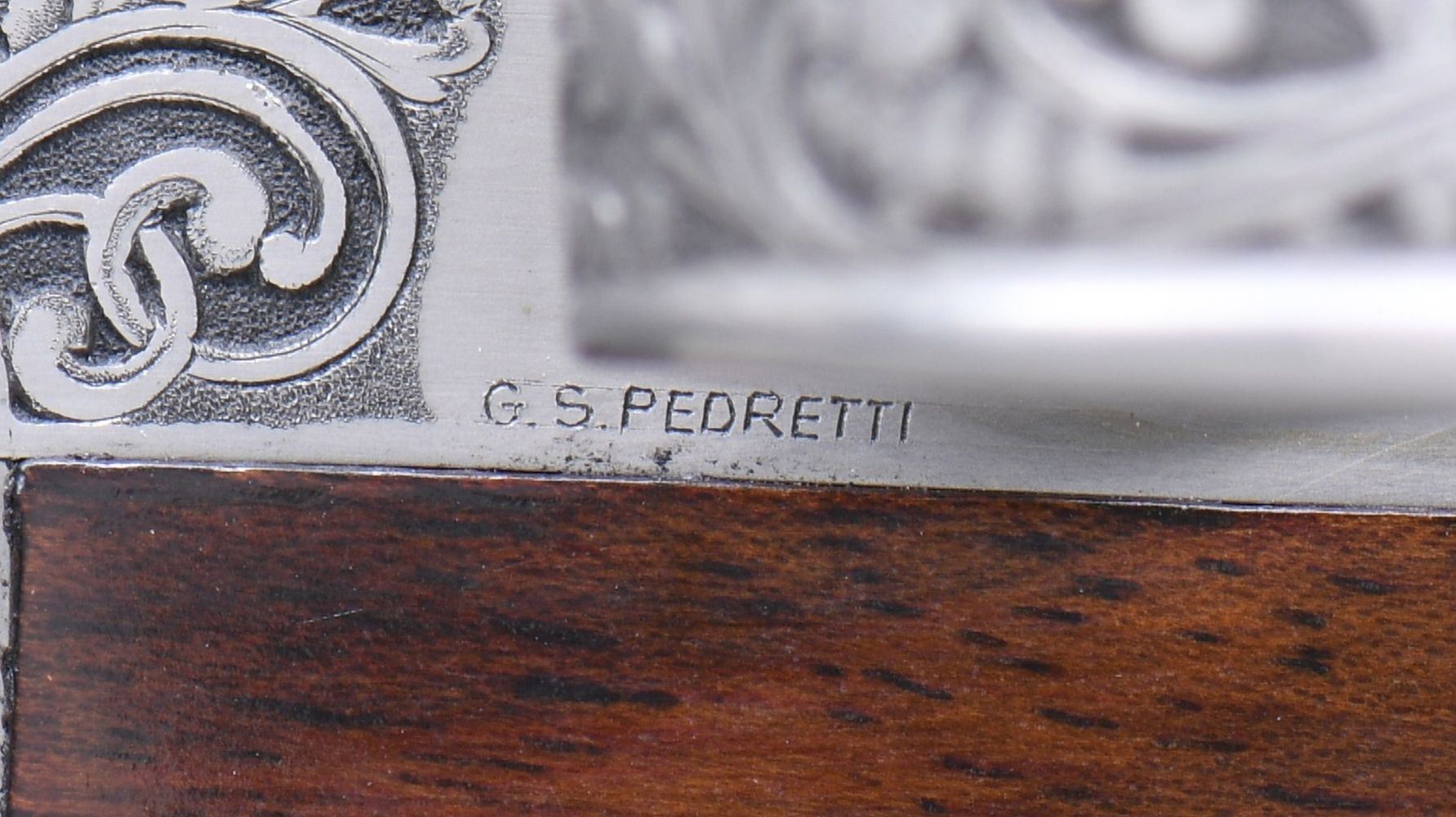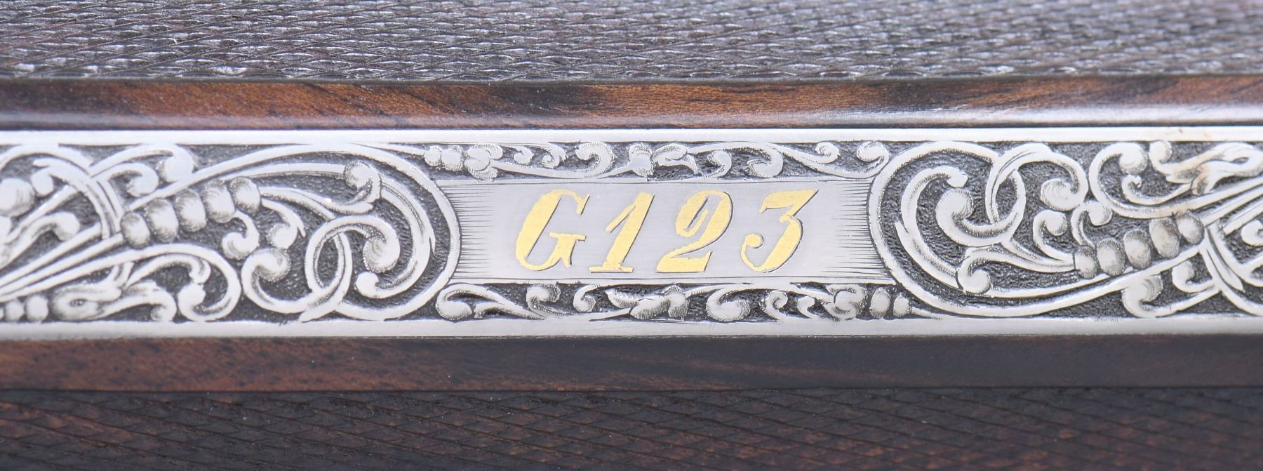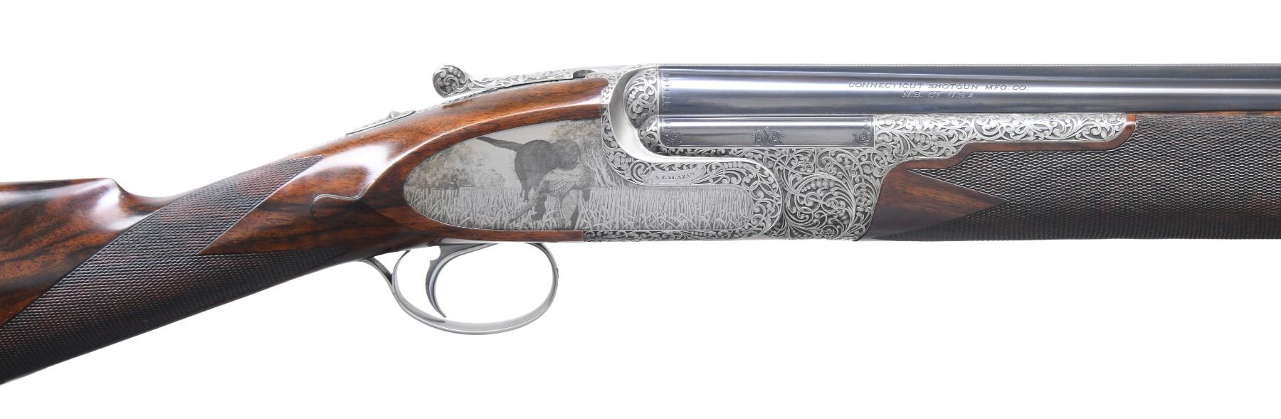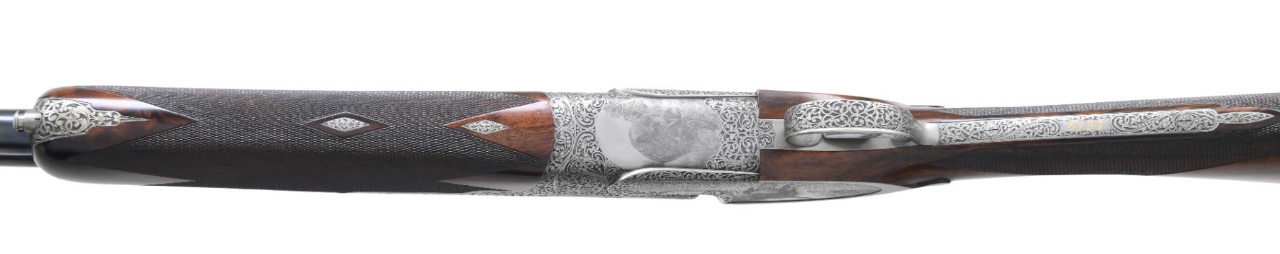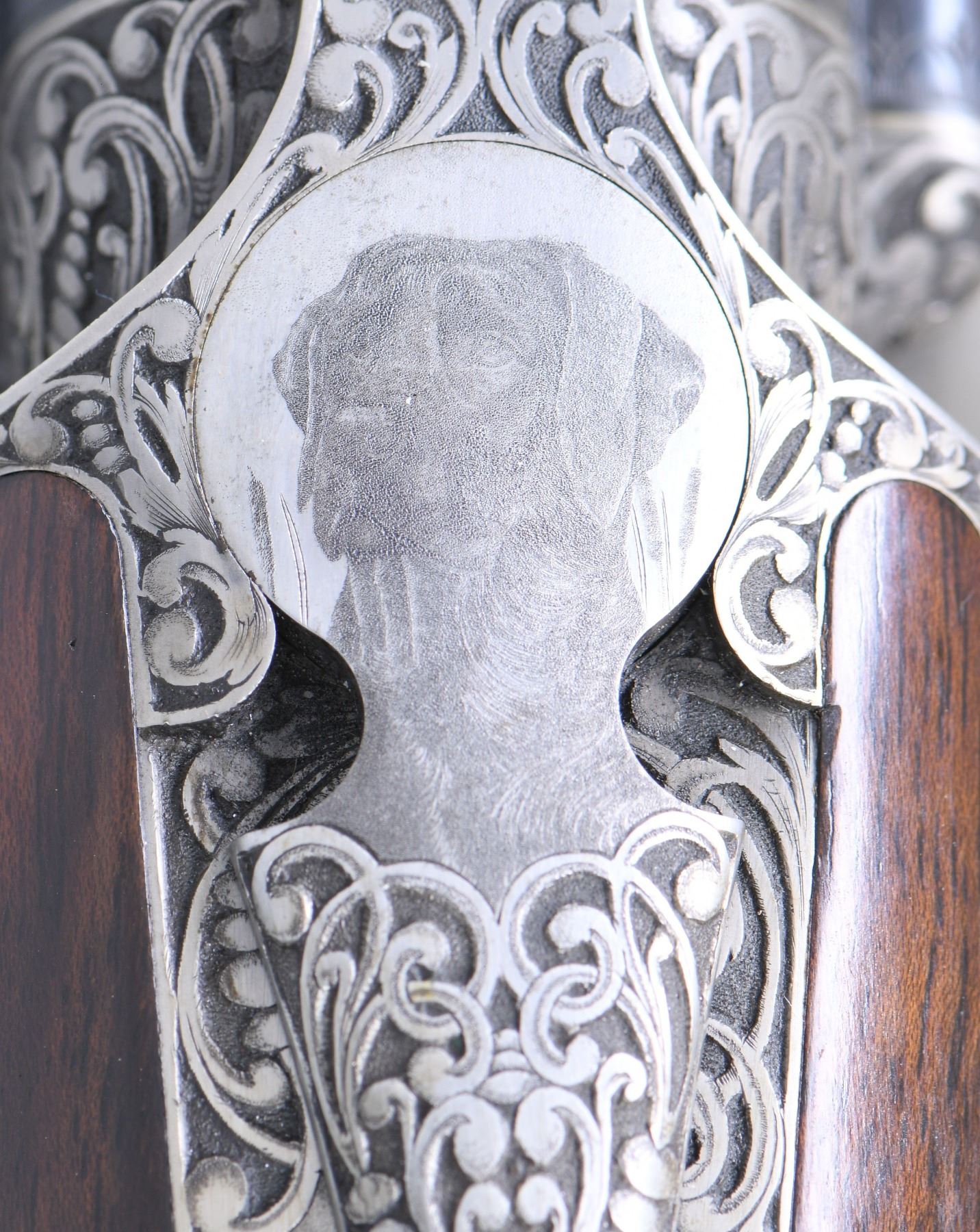 SCROLL & BULINO WORK BY GIANCARLO & STEFANO PEDRETTI. Cal. 12 Ga. S# G123. The 30" demi-block barrels are fitted with flat matted solid rib. Left side of top barrel is marked "A. GALAZAN" and right side is marked with Connecticut Shotgun name and address. Barrel flat is marked with S# and caliber information. Coin finished completely pinless low profile Boss style O/U action is fitted with non-automatic safety ("SAFE" inlaid in gold) and single non-selective trigger. Action is engraved with full coverage truly exceptional large open scroll with beaded highlights which is beautifully shaded. On bottom of action is an intricately detailed Bulino scene of wild hog or Russian boar standing in open field with sprigs of grass in foreground and dramatic woods behind. Lockplates are completely engraved with Bulino scenes of a black lab. On left lockplate he is retrieving a mallard from a cattail swamp. On right side he is retrieving a ring neck pheasant from a cut-over corn field. Top lever pivot is engraved with a portrait of this dog and a mallards head is exposed when the gun is opened. Backgrounds are also amazingly detailed. This fine work is by the well known father and son team Giancarlo & Stefano Pedretti whose signature appears on trigger plate and lower left of duck scene. The fine relief scroll continues on to single beaded trigger guard bow and tang which has S# inlaid in gold. Straight grip buttstock is made of a fine piece of stump figured and well marbled European walnut and measures 14-5/8" over checkered wood butt with engraved steel heel and toe plates. Stock features drop points, well cut borderless point pattern checkering at grip and a gold oval on toeline engraved "RJB". Matching full one piece ejector forend with Anson type release has iron shaped in classic Boss style which is engraved to match action. MEASUREMENTS: BBLS: Bore Diameter: O .729. U .729. Restriction: O .015 (mod). U .010 (IC). Wall thickness: O .029. U .028. STOCK: DAH: 2". DAC: 1-1/2". CAST: off about 1/4". LOP: 14-5/8". WEIGHT: 8 lb. 0 oz. CONDITION: exceptionally fine; essentially "As New" with only a very few very minor marks in all wood and metal finishes. Appears unfired with perfect bores. Mechanically crisp except trigger will not set up for second shot. (25-1475/MGM). MODERN. $35,000-55,000.