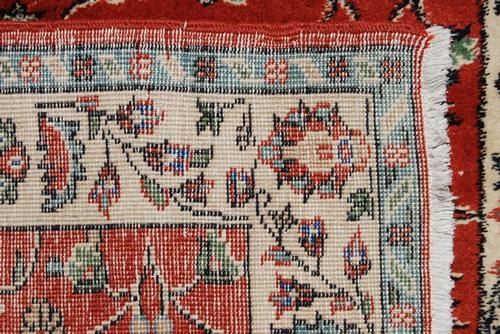 LOVELY AND ELEGANT ALLOVER FLORAL TURKISH RUG. SIZE 3.11 X 6.11 FEET, MADE OF FINE QUALITY WOOL PILE ON COTTON FOUNDATION, ALL NATURAL VEGETABLE DYE, THIS FINE QUALITY RUG INCORPORATES A BEAUTIFUL ALLOVER FLORAL PATTERN AND IS CONTRASTED BEAUTIFULLY BY A LIGHTER COLORED INTRICATELY DONE FLORAL BORDER. A VERY NICE RUG WITH A GREAT CONTRAST IN COLORS. HAND WOVEN IN TURKEY.
