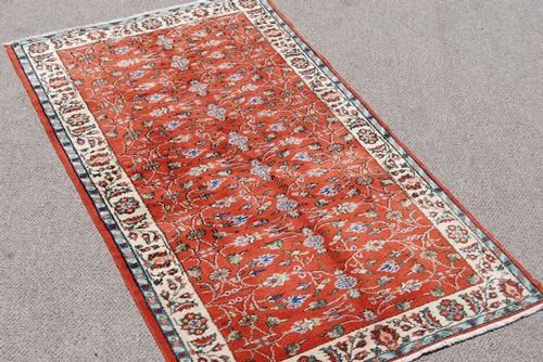 LOVELY AND ELEGANT ALLOVER FLORAL TURKISH RUG. SIZE 3.11 X 6.11 FEET, MADE OF FINE QUALITY WOOL PILE ON COTTON FOUNDATION, ALL NATURAL VEGETABLE DYE, THIS FINE QUALITY RUG INCORPORATES A BEAUTIFUL ALLOVER FLORAL PATTERN AND IS CONTRASTED BEAUTIFULLY BY A LIGHTER COLORED INTRICATELY DONE FLORAL BORDER. A VERY NICE RUG WITH A GREAT CONTRAST IN COLORS. HAND WOVEN IN TURKEY.