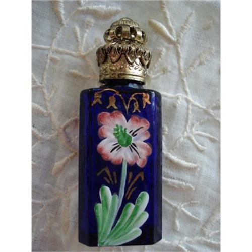 Ever so pretty is this rich cobalt blue small perfume bottle with filigree top and decorated with hand enameled flowers. The perfume bottle stands 2.5 inches high including the stopper. Its in beautiful condition and would be a fabulous addition to your vanity or perfume bottles collection.