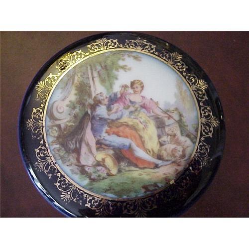 <table width="100%" border="0" cellspacing="0" cellpadding="4"><tr><td><em> </em></td></tr><tr> <td width="100%"> Beautiful antique hinged powder or jewel box. This lovely porcelain box has a French romantic scene, surrounded by gold and having a rich Limoges-Sevres like cobalt blue background with ormolu fittings. The box is large measuring 2 1/2 inches high, and 4 1/4 inches across. The condition is wonderful, no chips or cracks, just lovely. A most beautiful antique dresser box to enjoy displaying on your vanity or cabinet. </td></tr><tr> <td> </td></tr><tr> <td>Reference #: TVPB783</td></tr><tr><td>Condition:Very Fine All Original</td></tr><tr><td>Year:1880-1900</td></tr><tr><td>Title:LOVELY ANTIQUE FRENCH PORCELAIN POWDER BOX</td></tr><tr><td>Location:WA</td></tr></table>