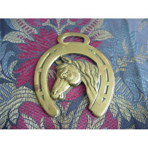 Horse brass are the brass ornaments fixed to the vertical leather chest strap or other parts of a horse's harness. Horse owners from the late 19th Century onward have shown their pride in their horses by adorning harnesses with these frequently ornate and highly symbolic attachments. They make a fascinating collection, and remain hard enough to find to be highly valued and very much sought after. They originated in England as Gypsy amulets attached to horse tack in the hope of warding off evil spirits. We are excited to offer for sale from a private collection some truly unique and beautiful pieces, all are original-NOT recent recasts. Most date from about the 1880-90s are in original condition, we have not polished them, but left the original patina as the collector had them. These are highly decorative and make fascinating gifts! This particular horse brass has a very detailed high relief horse head within a horse shoe, very beautiful authentic old horse brass that measures about 4 ½ inches by 3 ¼ inches. Fabulous antique horse brass!