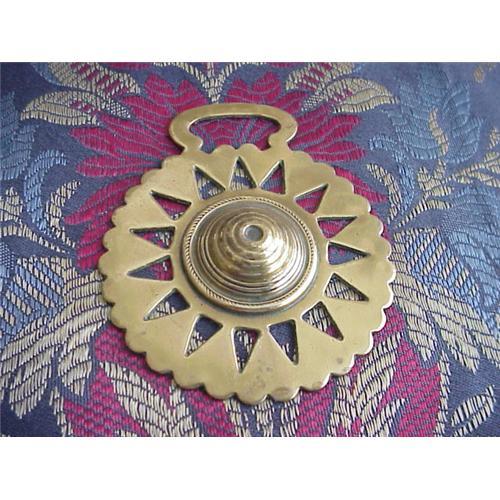 Horse brass are the brass ornaments fixed to the vertical leather chest strap or other parts of a horse's harness. Horse owners from the late 19th Century onward have shown their pride in their horses by adorning harnesses with these frequently ornate and highly symbolic attachments. They make a fascinating collection, and remain hard enough to find to be highly valued and very much sought after. They originated in England as Gypsy amulets attached to horse tack in the hope of warding off evil spirits. We are excited to offer for sale from a private collection some truly unique and beautiful pieces, all are original-NOT recent recasts. Most date from about the 1880-90s are in original condition, we have not polished them, but left the original patina as the collector had them. These are highly decorative and make fascinating gifts! This particular horse brass has a lovely intricate beehive like centre surrounded with a fine cable like coil, very interesting authentic old horse brass that measures about 4 inches by 3 ½ inches, about ¾ inches high. Fabulous antique horse brass!
