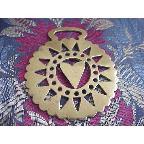 Horse brass are the brass ornaments fixed to the vertical leather chest strap or other parts of a horse's harness. Horse owners from the late 19th Century onward have shown their pride in their horses by adorning harnesses with these frequently ornate and highly symbolic attachments. They make a fascinating collection, and remain hard enough to find to be highly valued and very much sought after. They originated in England as Gypsy amulets attached to horse tack in the hope of warding off evil spirits. We are excited to offer for sale from a private collection some truly unique and beautiful pieces, all are original-NOT recent recasts. Most date from about the 1880-90s are in original condition, we have not polished them, but left the original patina as the collector had them. These are highly decorative and make fascinating gifts! This particular horse brass has lovely openwork with a central heart centre, very interesting authentic old horse brass that measures about 4 inches by 3 ½ inches, about 1 inch high. Fabulous antique horse brass!