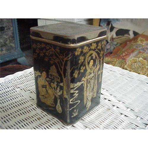 Beautiful antique Tea Tin with an Oriental theme dating from about 1910-20s. It stands 6 inches high, being 4 inches by 4 inches square. There is wear to the top and sides, but still displays beautifully. A wonderful antique tea collectible to display and enjoy decorating with!