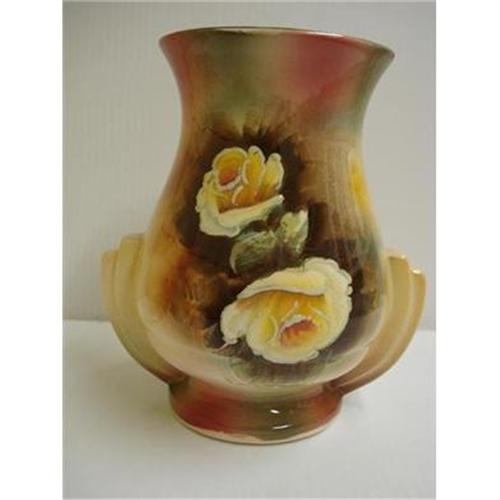 BEAUTIFUL ART DECO STYLE VASE, ADORNED WITH CREAM COLOR SHABBY CHIC ROSES,as per images - HAND PAINTED - LOVE THE DECO DESIGN AS HANDLES, Excellent condition but for some glaze crazing,sIGNED mADE IN eNGLAND # 43, Measuring about 7" high and from handle to handle 6 1/2" - US Buyer to pay 9.00 for shipping plus insurance.THANKS.