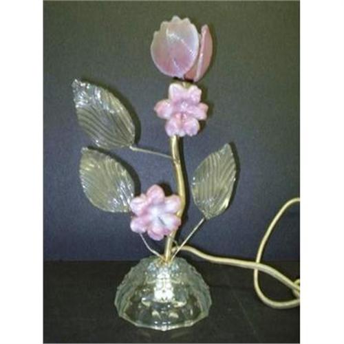 BEAUTIFUL ART GLASS, DELICATE, FLORAL LAMP, EACH LATICE AND LEAF WAS MADE FROM LOVELY ART GLASS, AND THEPEDESTAL IS CLEAR PATTERN GLASS, MADE IN USA, AND STANDING ABOUT 10 inch high,lamp and cord are both in excellent condition, It takes tiny Christmas type bulb, There is none in it, US Buyer to pay 9.50 for shipping plus insurance.THANKS.
