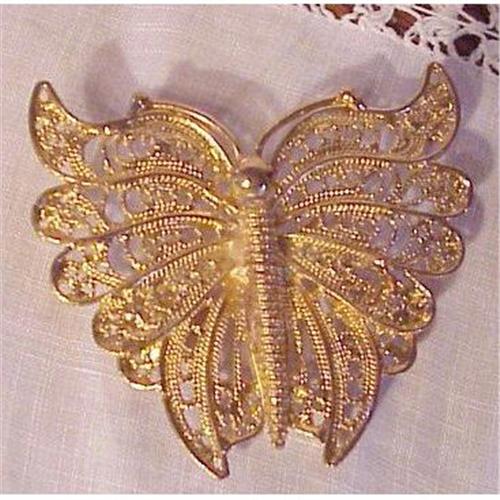 VERY PRETTY VINTAGE BROOCH, DEPICTING LARGE GOLD TONE BUTTERFLY, MADE IN FILIGREE STYLE, EXCELLENT CONDITION, MEASURES CLOSE TO 2" X OVER 2", US BUYER TO PAY 7.00 FOR SHIPPING PLUS INSURANCE.THANKS.