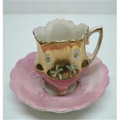 </font></strong>THIS IS LOVELY ANTIQUE DEMITASE CUP AND SAUCER,MOST PROBABLY MADE IN GERMANY EARLY 1900's,IT IS A LITTLE GEM BEING HAND PAINTED SHOWING WHITE DAIDIES OVER THE LOVELY HEAVY GILT WHICH STOPS AT HALF A WAY AND THEN BEAUTIFUL PINK COLOR CONTINUES ALL THE WAY TO THE TINY FEET - Excellent condition but for a tiny nick or factory imperfaction on inside the top edge, which is not visible - Cup measures about 2" high and saucer 3 3/4" in diam., US Buyer to pay 7.00 for shipping plus insurance.THANKS.</font>