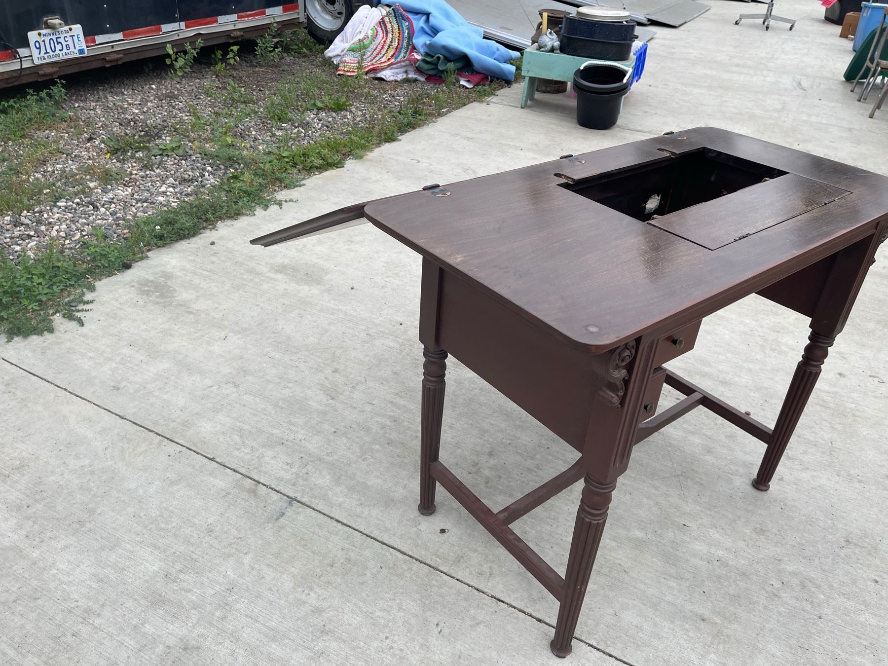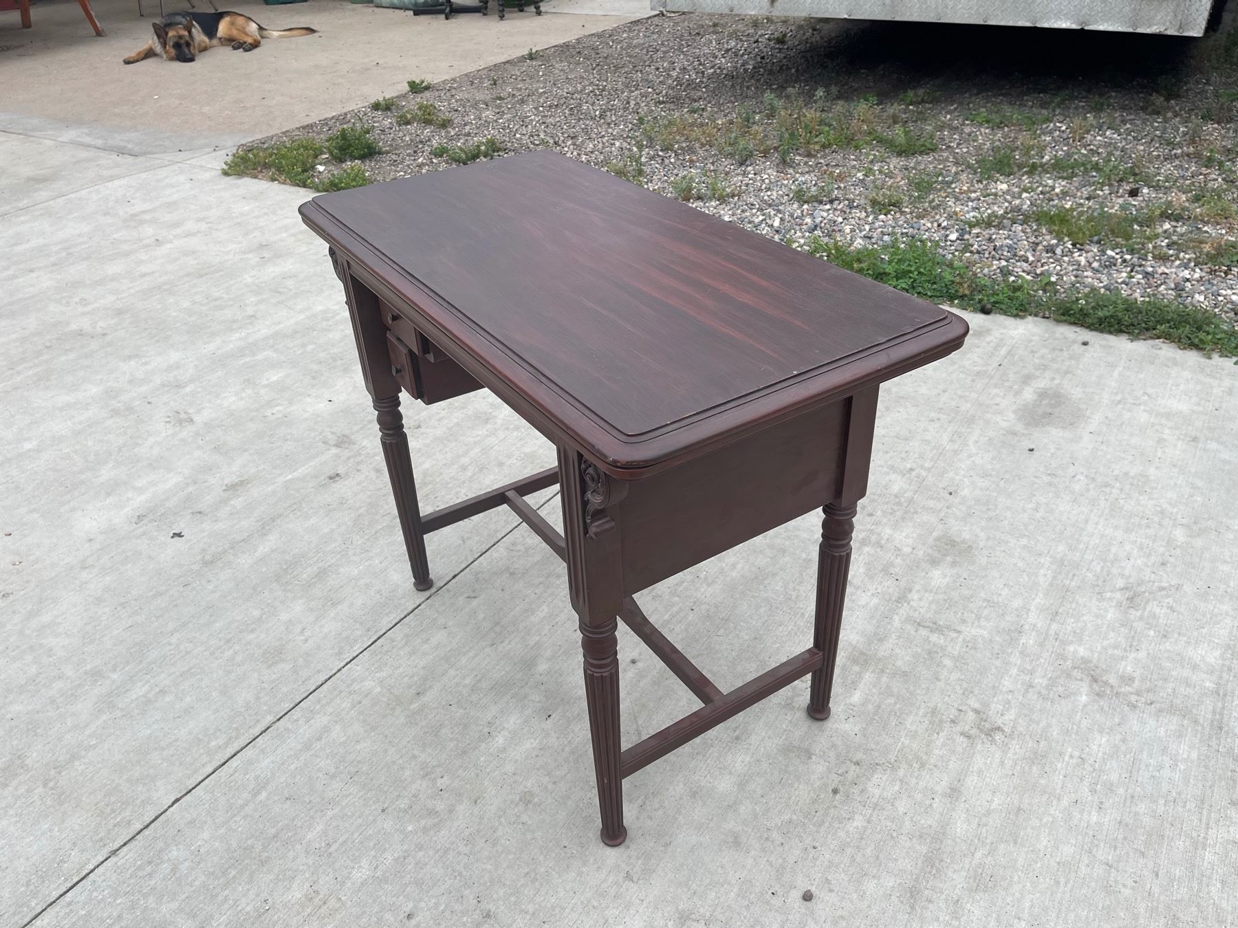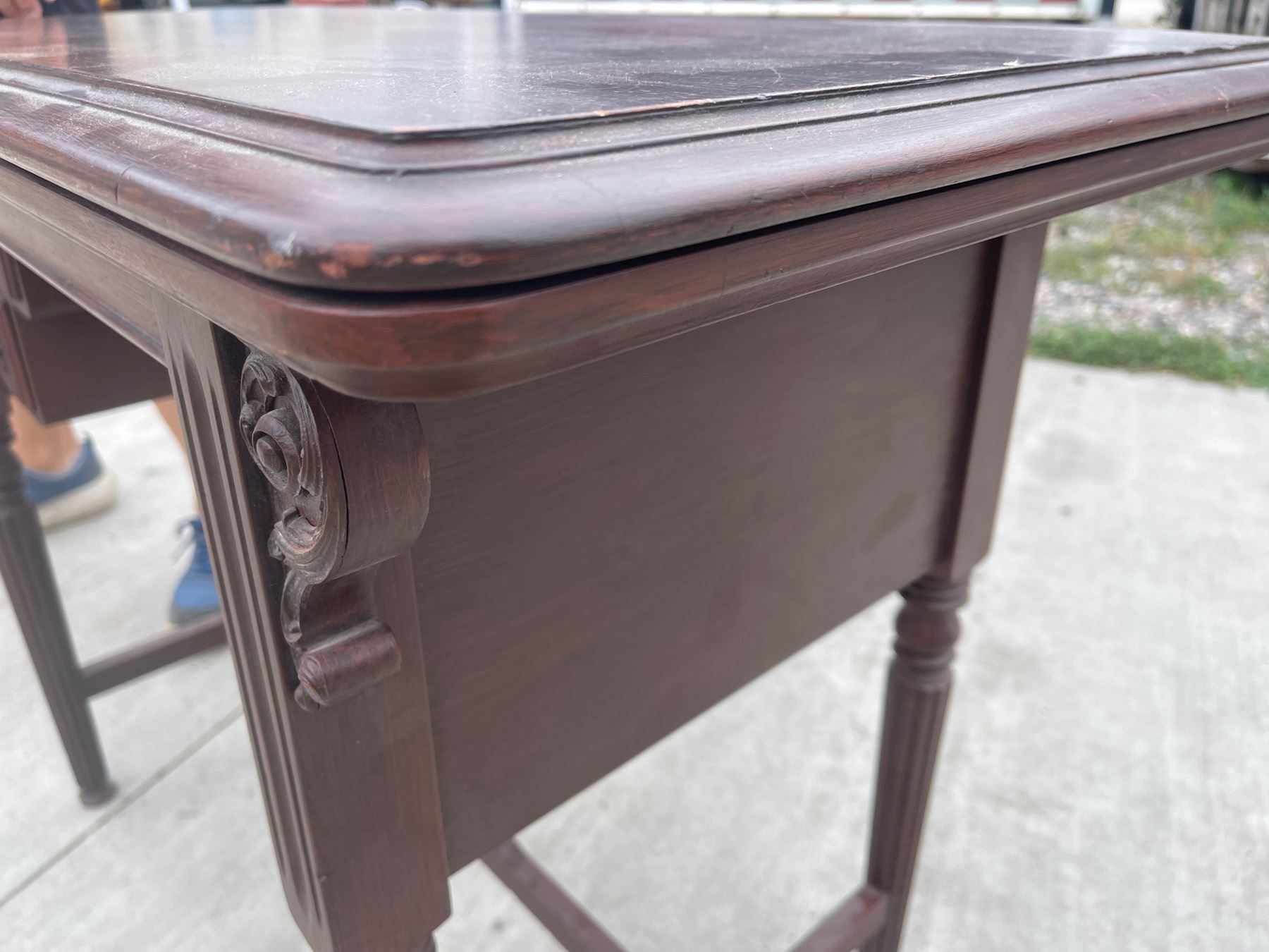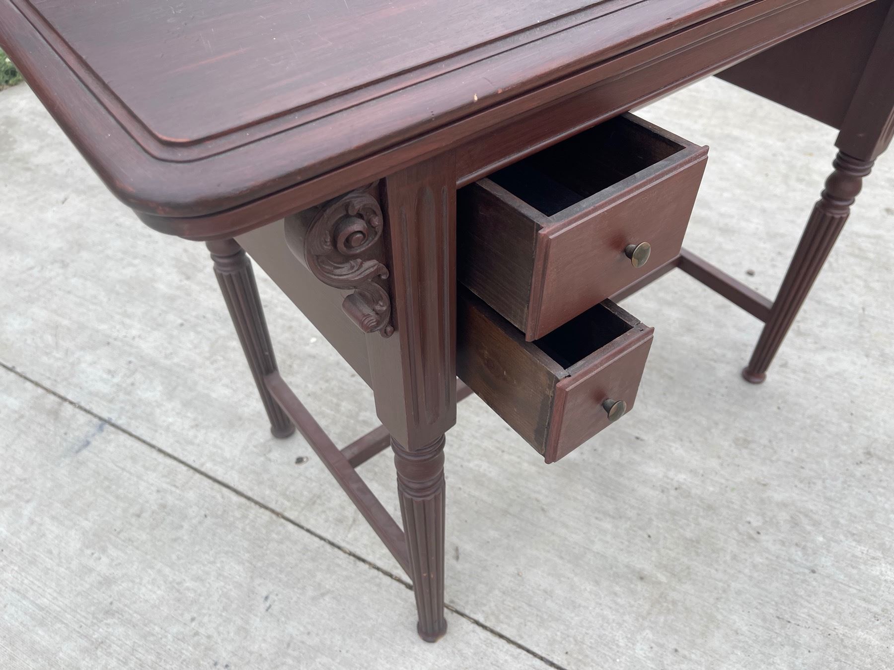 THIS IS A LOVELY DESK, BUT IT WAS A SEWING TABLE; CHECK OUT THE LOVELY CARVED ACCENTS ON THE SIDES AND THE CROSS-BEAM SUPPORT; THE SPACE WHERE THE MACHINE WAS STORED IS ENCLOSED AND COULD BE USED FOR STORAGE; IT IS UNIQUE, LOVELY, AND FUNCTIONAL