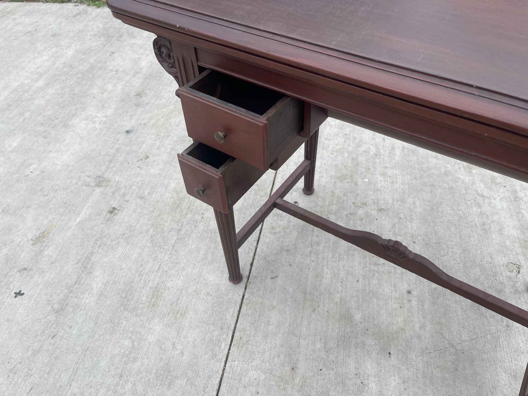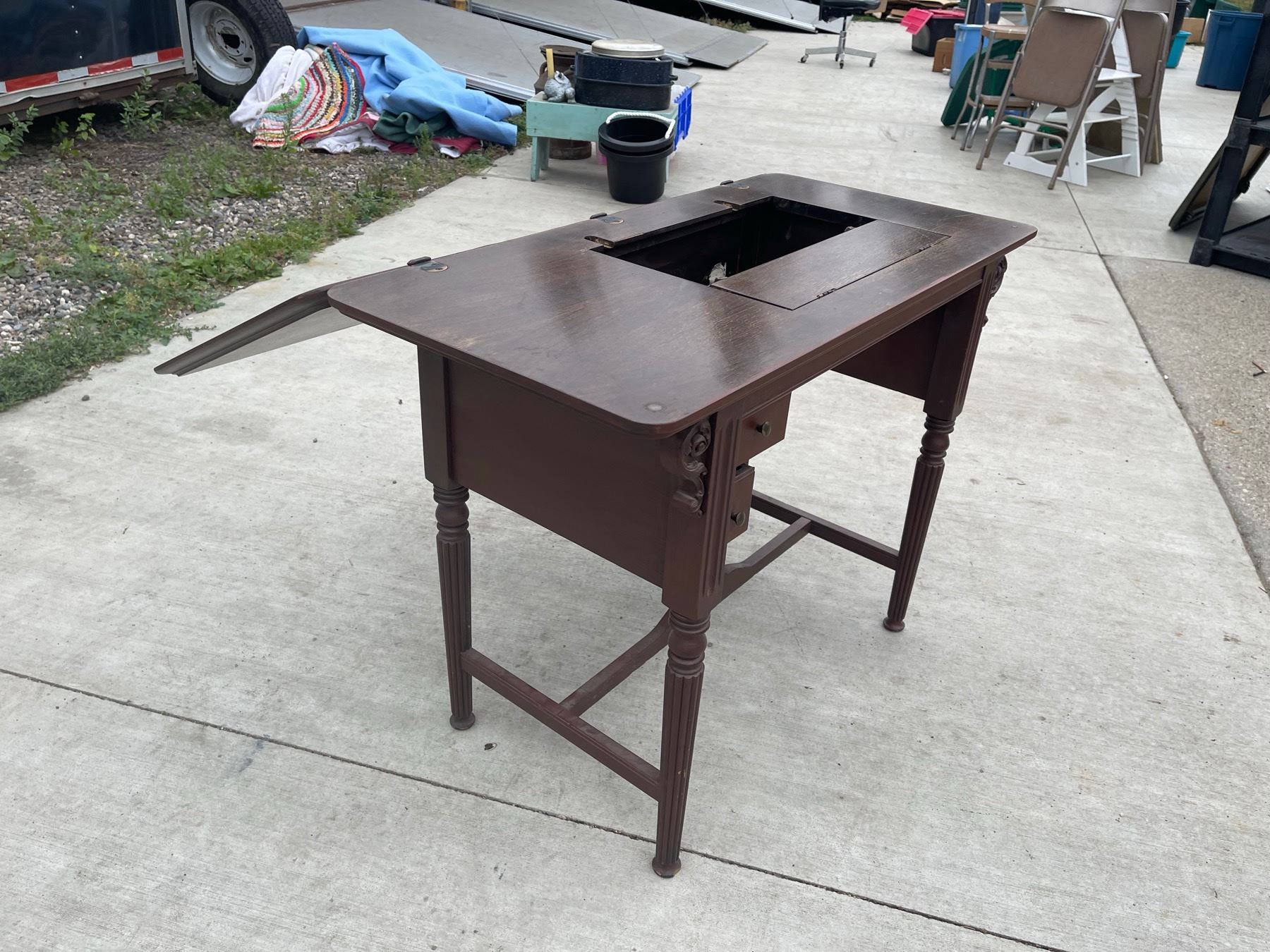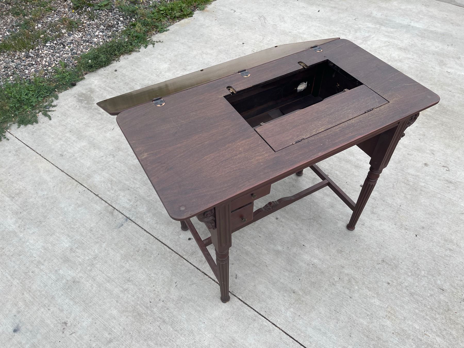 THIS IS A LOVELY DESK, BUT IT WAS A SEWING TABLE; CHECK OUT THE LOVELY CARVED ACCENTS ON THE SIDES AND THE CROSS-BEAM SUPPORT; THE SPACE WHERE THE MACHINE WAS STORED IS ENCLOSED AND COULD BE USED FOR STORAGE; IT IS UNIQUE, LOVELY, AND FUNCTIONAL