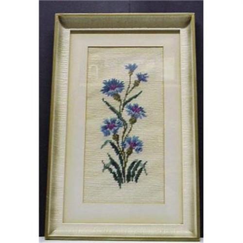 THIS IS LOVELY FRAMED WITH GLASS NEEDLEWORK PICTURE, DEPICTING PRETTY CORNFLOWERS, THIS IS QUALITY PROFESSIONALY FRAMED PICTURE BY ONE OF THE PICTURE GALLERIES IN CANADA, label on the back of the picture, FRAME IS MADE FROM WOOD FINISHED IN ANTIQUE WHITE WITH GOLD ACCENTS, PICTURE IS READY TO BE DISPLAYED, MEASURES ABOUT 18" X 11 1/4" EXCELLENT CONDITION, US BUYER TO PAY 12.00 FOR SHIPPING (heavy) PLUS INSURANCE.THANKS