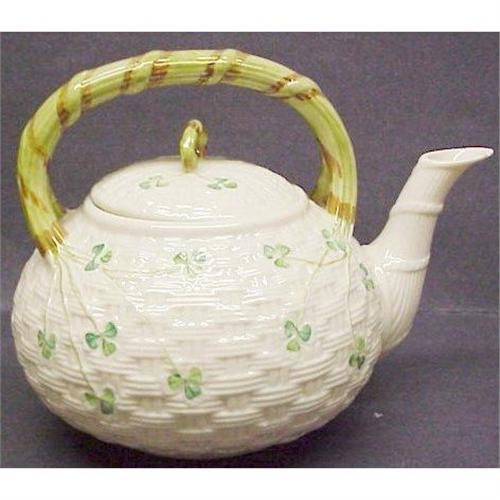 BEAUTIFUL IRISH BELLEEK LARGE TEA POT, THIS IS WHAT IT IS CALLED 6 CUP, EXCELLENT CONDITION, IT SEEMS NEVER USED BUT IT DOES HAVE TINY NICK ON THE SPOUT,HARDLY VISIBLE AND IT COULD BE EVENED UP WITH VERU FINE SAND PAPER, MEASURES FROM HANDLE TO SPOUT 8" AND 6" HIGH, US BUYER PLEASE PAY 14.00 FOR INSURED SHIPPING.THANK YOU.