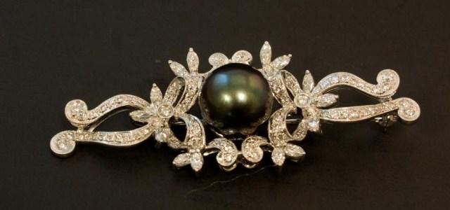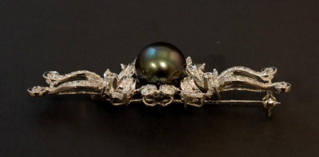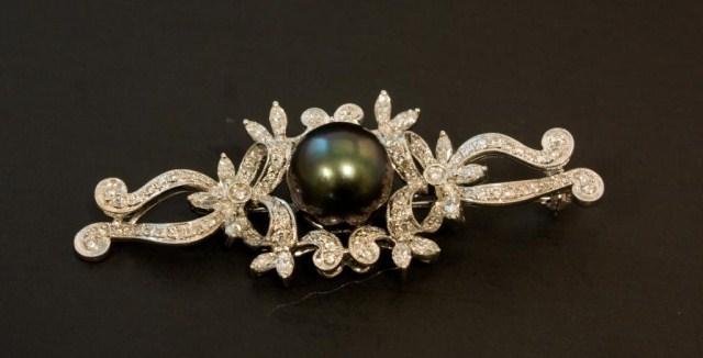 Lovely ladies 18kt White Gold & Black Pearl Pin. 10mm Black Pearl enhanced by approx 1.50ct diamonds.