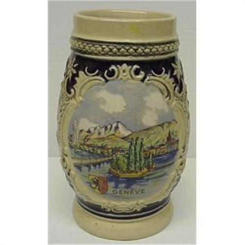 HIGHLY DETAILED OLD STONEWARE BEER MUG, DECORATED IN HIGH RELEIF LOVELY CHURCH, ON THE OTHER SIDE FOREST COTTAGE AND IN THE CENTER BEAUTIFUL PICTURE SIGNED "GENEVE" WITH THE SWISS? SHIELD NEXT TO IT.SIGNED WIT CROSS SWORDS? MARK, EXCELLENT CONDITION, FREE OF DAMAGE, MEASURES 6 1/2" HIGH, US BUYER PLEASE PAY 9.00 (HEAVY), FOR SHIPPING PLUS INSURANCE.THANKS!