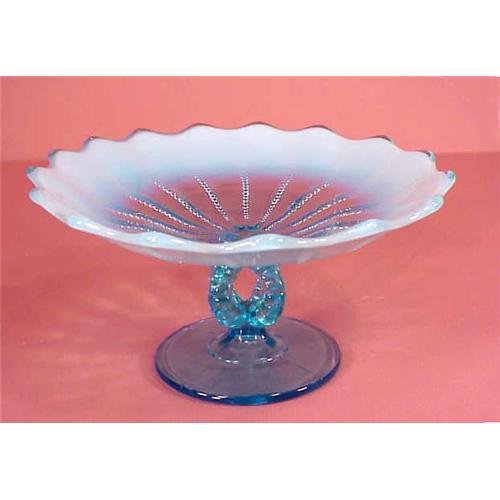 Lovely Old Opalescent Blue Glass Footed Comport Glass, Crystal:Glass Art Glass Lovely Old Opalescent Blue Glass Footed Comport Beautiful old opalescent blue Edged footed comport. This is a lovely piece with gorgeous blue colours and ornate footed pedestal. It may be old Fenton; it is unmarked but definitely of quality. It stands about 3 ½ inches high being about 7 inches across the top. In excellent condition. A most beautiful addition to one?s glass collection.