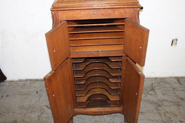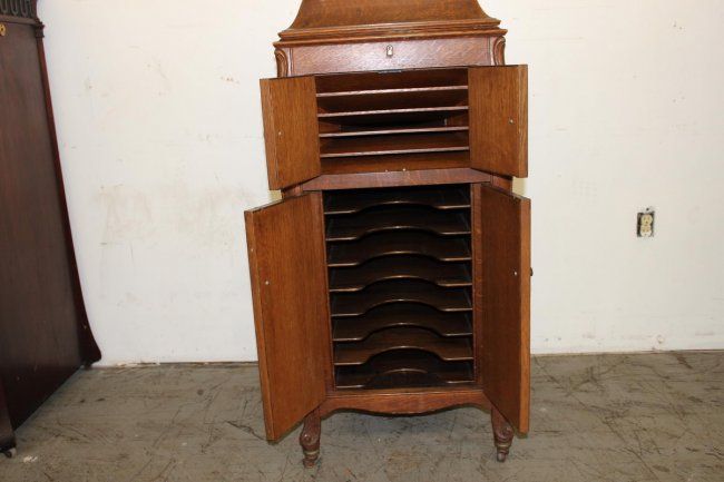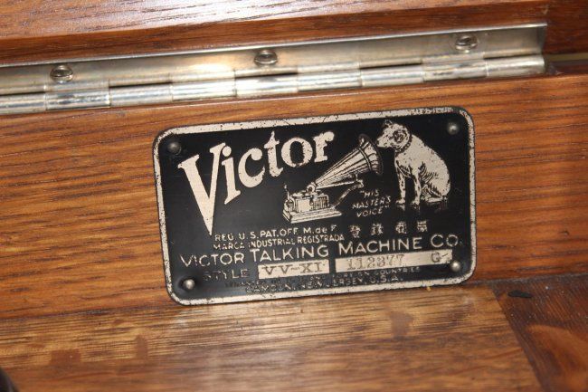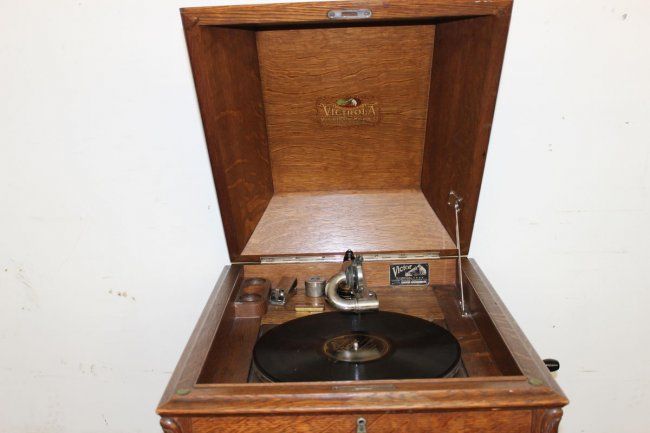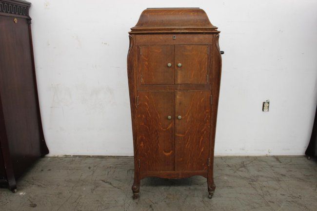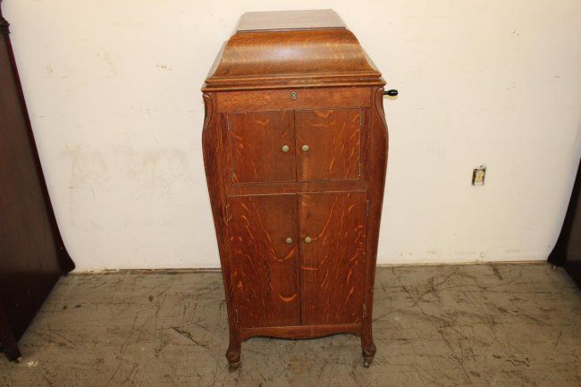 LOVELY QUARTER SAWN OAK DOUBLE FLOOR MODEL VICTROLA BY VICTOR WITH BUILT-IN RECORD CABINET - A BEAUTY WORKS GREAT WITH KEY - 45 X 20 X 23