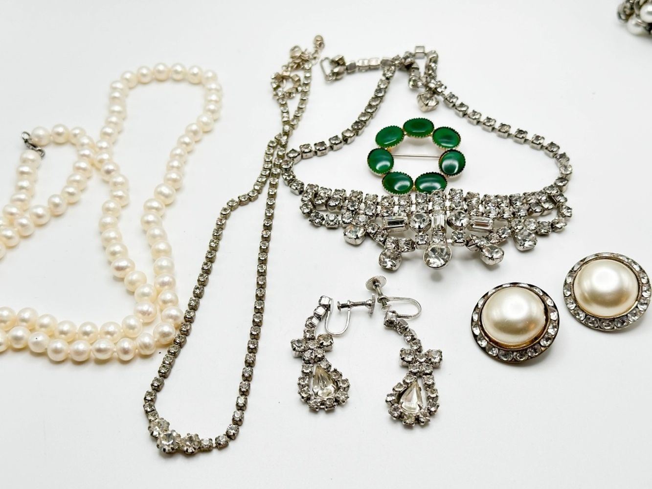 LOVELY RHINESTONES NECKLACES, EARRINGS, FAUX PEARL NECKLACE , SMALL GREEN STONE BROOCH