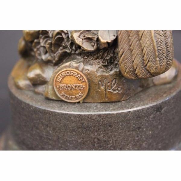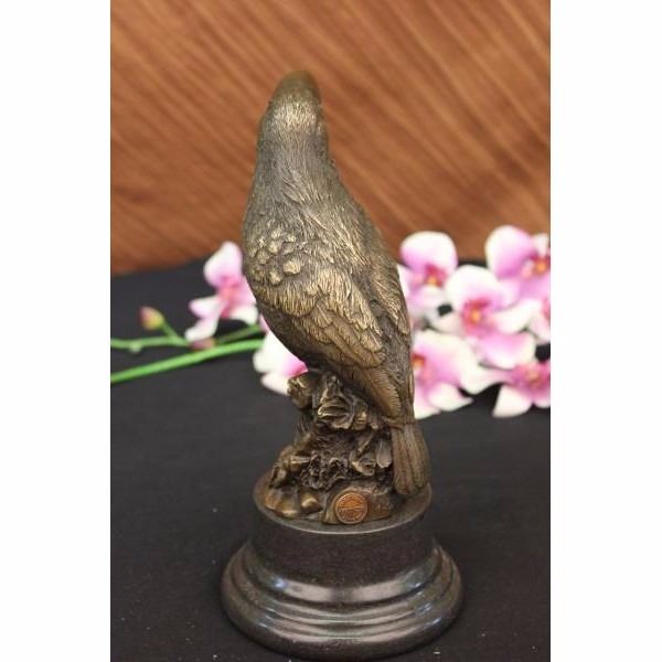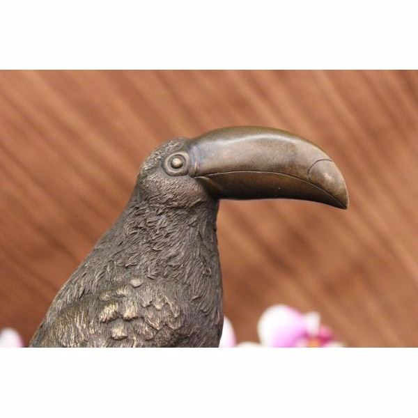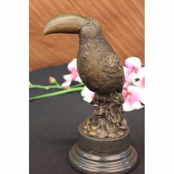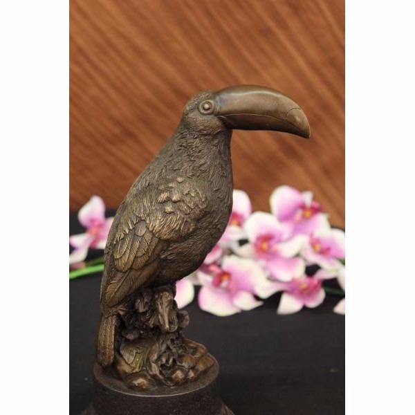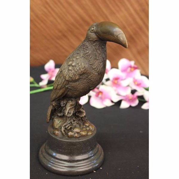 A stoic bird sits high, looking out at the land below. This would makea fine addition to any bird lover's collection. With a beak shapedlike the unusual Toucan, this sculpture will bring personality to anyroom. This fully detailed brown patina sculpture was cast using the"Lost Wax Method". It is 100% bronze and handmade and is signed by artist Milo. Condition : This sculpture is in perfect condition. Bronze Dimensions with Marble Base:Height 10" x Width 5" Marble size: Diameter 4 1/2" Height without base:9" Weight : 8 LBS Inventory : 26K2233562