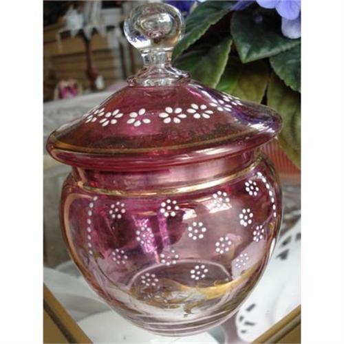 Most pretty Victorian cranberry flashed color glass covered jar or biscuit barrel with pretty white enameling and gold decorated. The jar with the lid stands 6 inches high and is in very nice condition, with only slight gold loss but in an even manner, otherwise just fine. The color is beautiful and the enameling is most pretty. A fine example of Victorian glass to add to your collection!