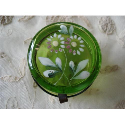 Delightful antique glass patch box or trinket box with hinge top. Its a pretty Victorian green glass with enamel flowers. The little box measures 2 inches across the top and is 1 inch high, in very nice condition-no chips or cracks. A delightful addition to your collection of Victorian glass, boxes and vanity items.