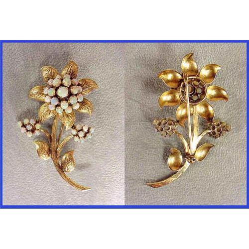 Breathtaking Antique Figural Solid Opal & Gold Brooch Antiques:Jewelry Exquisite gold and lustrous opals large brooch. This is a beauty! From about 1910-20 this brooch is of high quality. The gold tested to be 15 ct and is beautifully detailed with the leaves being chased. The flower head is high being in steps coming to a dome. The opals are full of lovely fire, genuine solid opals, not duplets or triplets. Truly opalescent colour to them. There are 36 opals, all set in this breathtaking flower design. This fine brooch measures about 2 ½ inches by 1 ½ inches at the widest portion. This is a high quality classic brooch that would become a favourite to wear