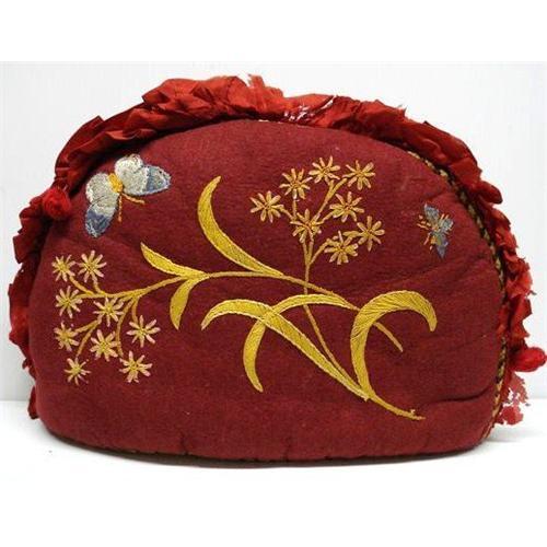 LOVELY VICTORIAN ERA TEA POT COZY MADE FROM WOOL LIKE FABRIC AND EMBROIDERED DEPICTING BLUE BUTTERFLIES AND GOLD COLOR FLOWERS, VERY NICE, THIS TEA COZY HAS A BURGUNDY SILK RUFFLES AND 4 POM-POMS, BUT SILK HAS BEEN DAMAGED FROM AGE, ALL ORIGINAL AND IN VERY GOOD CONDITION,FREE FROM HOLES BUT THE LINING HAS BEEN STAINED FROM THE TEA, KNOW-HOW CLEANING IS NEEDED,as per pictures, measures 17" X 10 1/2" - US BUYER TO PAY 9.00 FOR SHIPPING PLUS INSURANCE.THANKS.