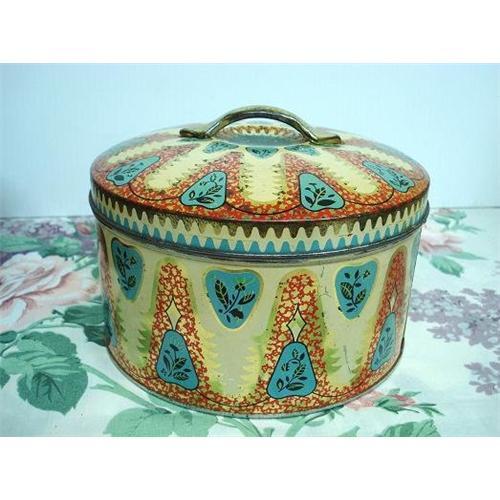 BEAUTIFUL OLD TIN BOX,DEPICTING VERY UNUSUAL DECORATIONS, as per images, WONDERFUL COLORS, Measuring about 6 3/4 inch in diam., and 5 inch high,excellent condition, no dents and no dents, US Buyer to pay 7.00 for shipping plus insurance.THANKS.
