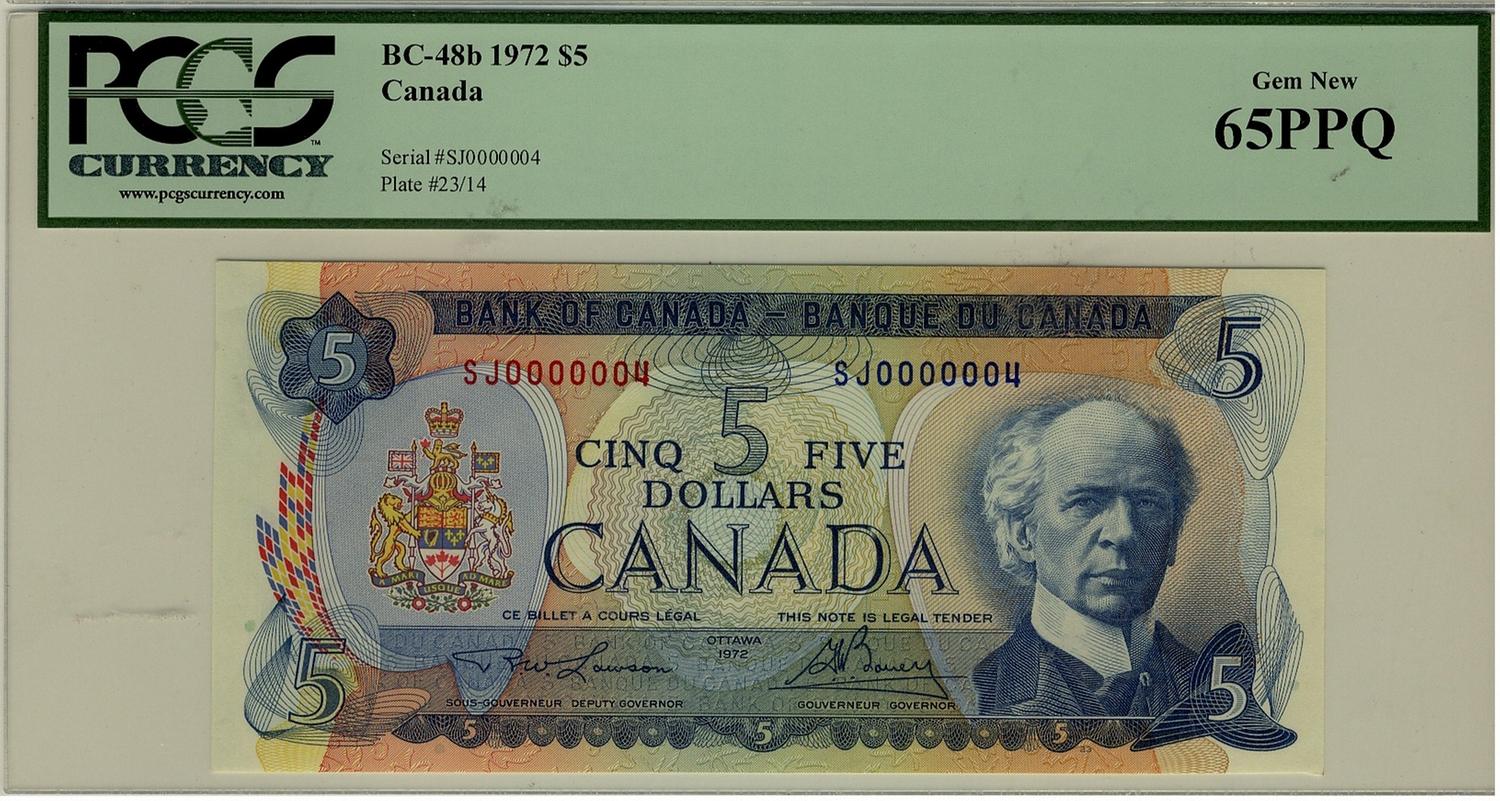 LOW SERIAL NUMBER 1972 $5 BC-48b #SJ0000004 PCGS GEM UNC 65PPQ.