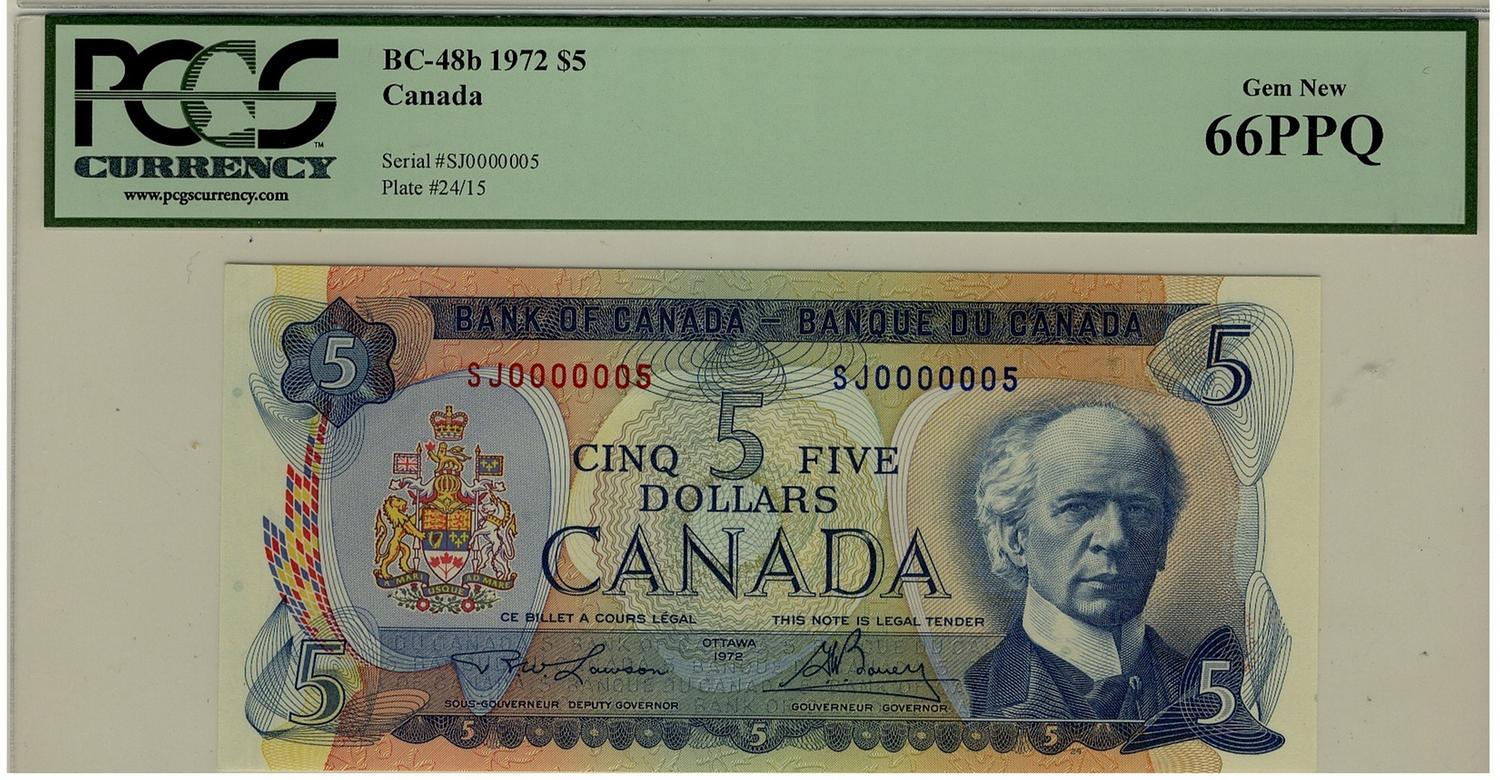 LOW SERIAL NUMBER 1972 $5 BC-48b #SJ0000005 PCGS GEM UNC 66PPQ.