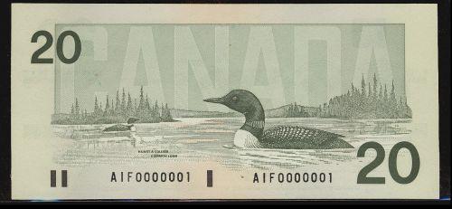 LOW SERIAL NUMBERED NOTE, AIF0000001 1991 $20 Thiessen-Crow ,Gem Unc. Very rare and rarely offered.