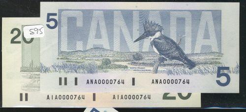 LOW SERIAL matched pair; 1986 $5, 1991 $20 both with serial #0000764. AU-UNC.