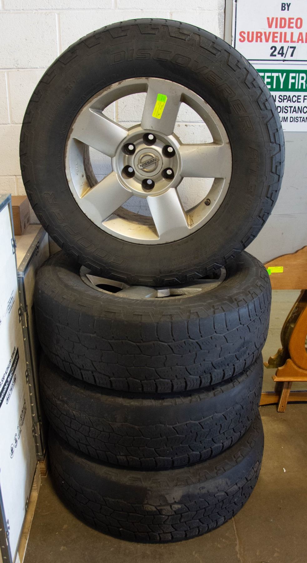 WORN 265/70R18, ON 6 BOLT PATTERN NISSAN RIMS **ALL ITEMS MUST BE REMOVED BY 5PM SATURDAY, SEPTEMBER 16TH 2023. ALL REMAINING ITEMS WILL BE SUBJECT TO A $6.00 PER DAY STORAGE CHARGE. ANY ITEMS REMAINING AFTER MONDAY, OCTOBER 2ND, 2023 WILL BE CONSIDERED FORFEITED. NO REFUNDS WILL BE ISSUED FOR FORFEITED ITEMS. TO SCHEDULE A PICK UP APPOINTMENT CLICK HERE