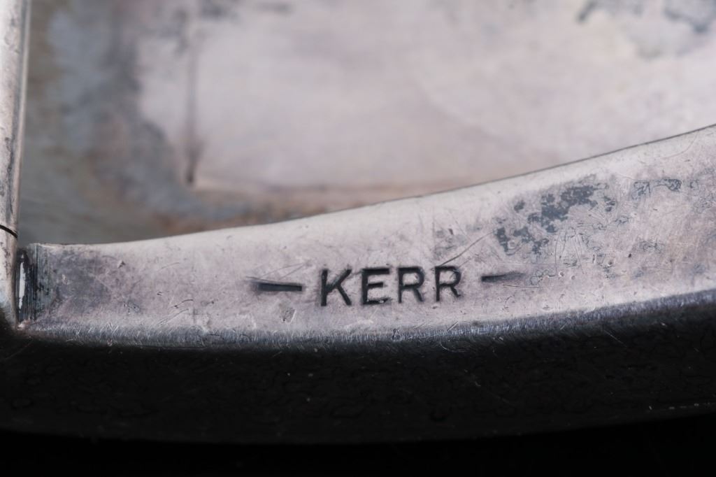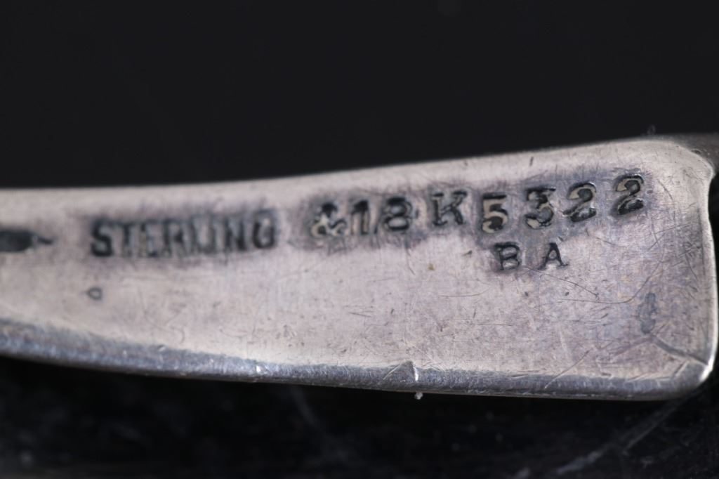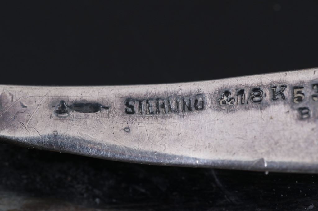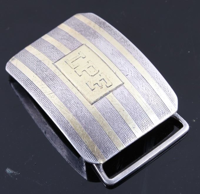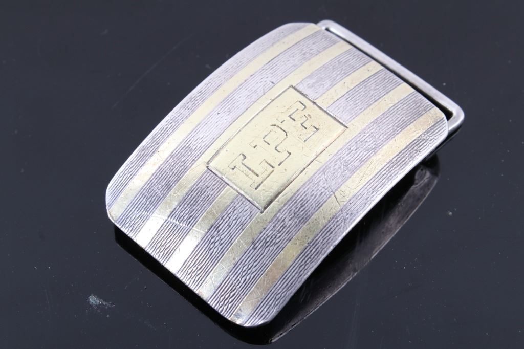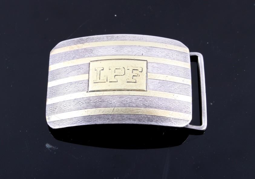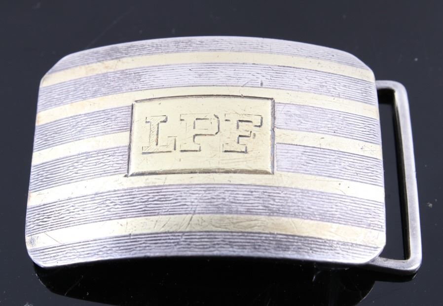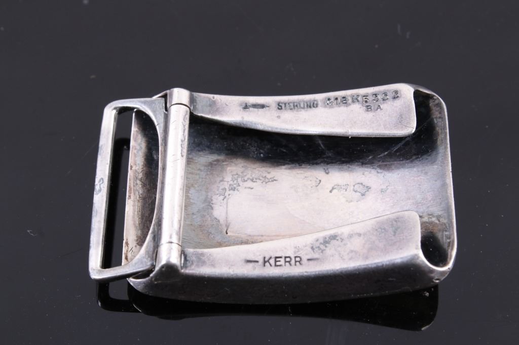 For your bidding pleasure is this LPF Stamped Kerr Sterling & 18kt Gold Slide Buckle. William B. Kerr Co. was a manufacturer of jewelry, flatware and hollow-ware. Established in Newark, New Jersey in 1855, they are listed in the 1915 Edition of the Trademarks of the Jewelry and Kindred Trades. Kerr's hallmark was a fasces - a single-bit axe with rods bound with straps. They used this trademark of a medieval axe from 1855 until 1892. This buckle is marked 'LPF on the front with banded 18k gold pinstriped and stamp is 18k gold. The piece is marked on the back with the makers mark, Sterling & 18K, 5322BA , and -KERR-. This is a slide style of their buckles with a rotating hinge to attach to the belt and a slide portion that the belt is fed through. The measurements of This buckle are 2" x 1 1/4". The weight of this buckle is .78oz.