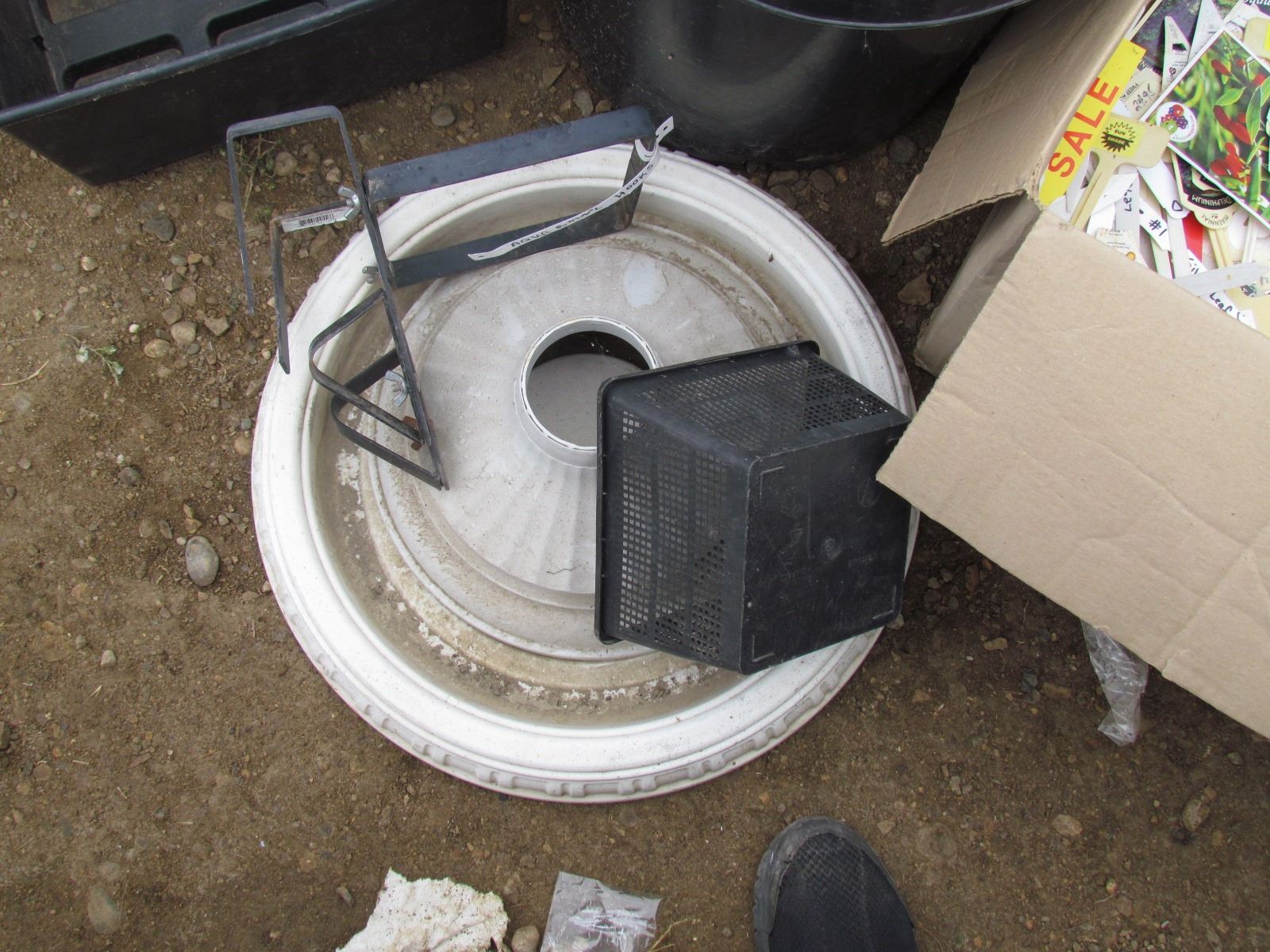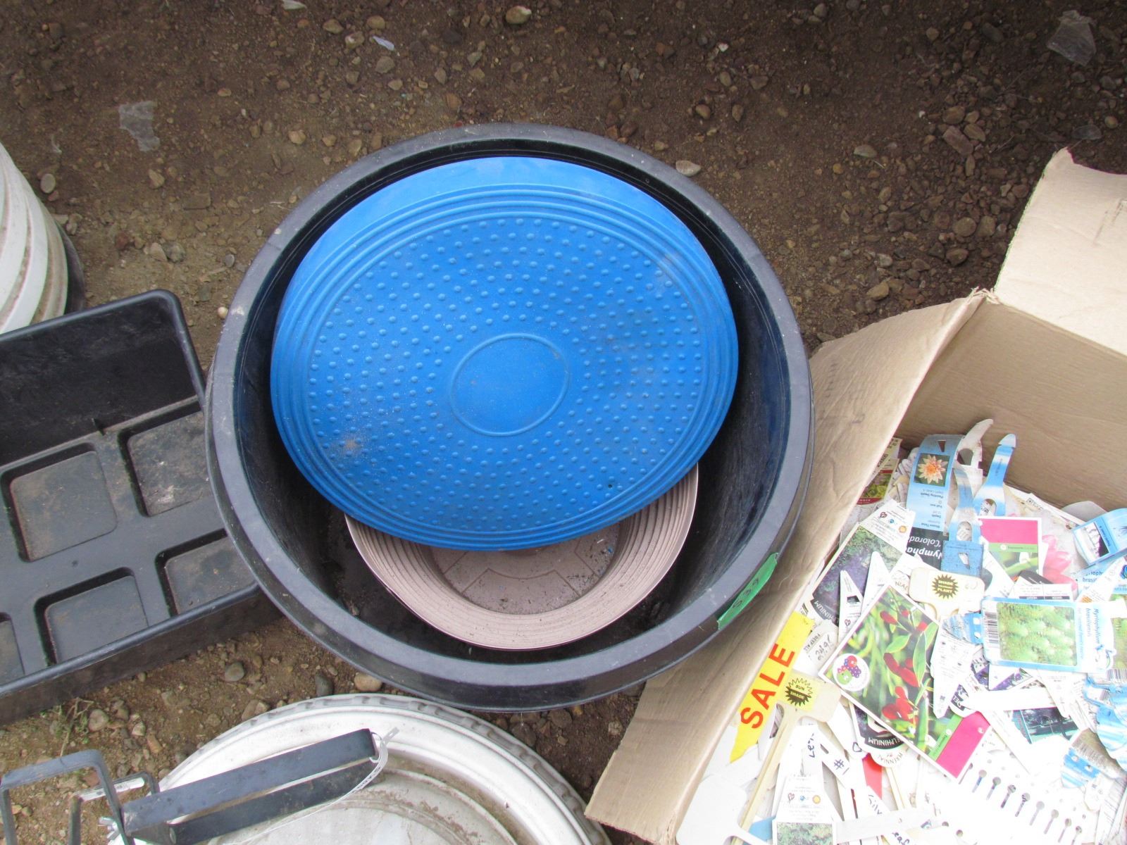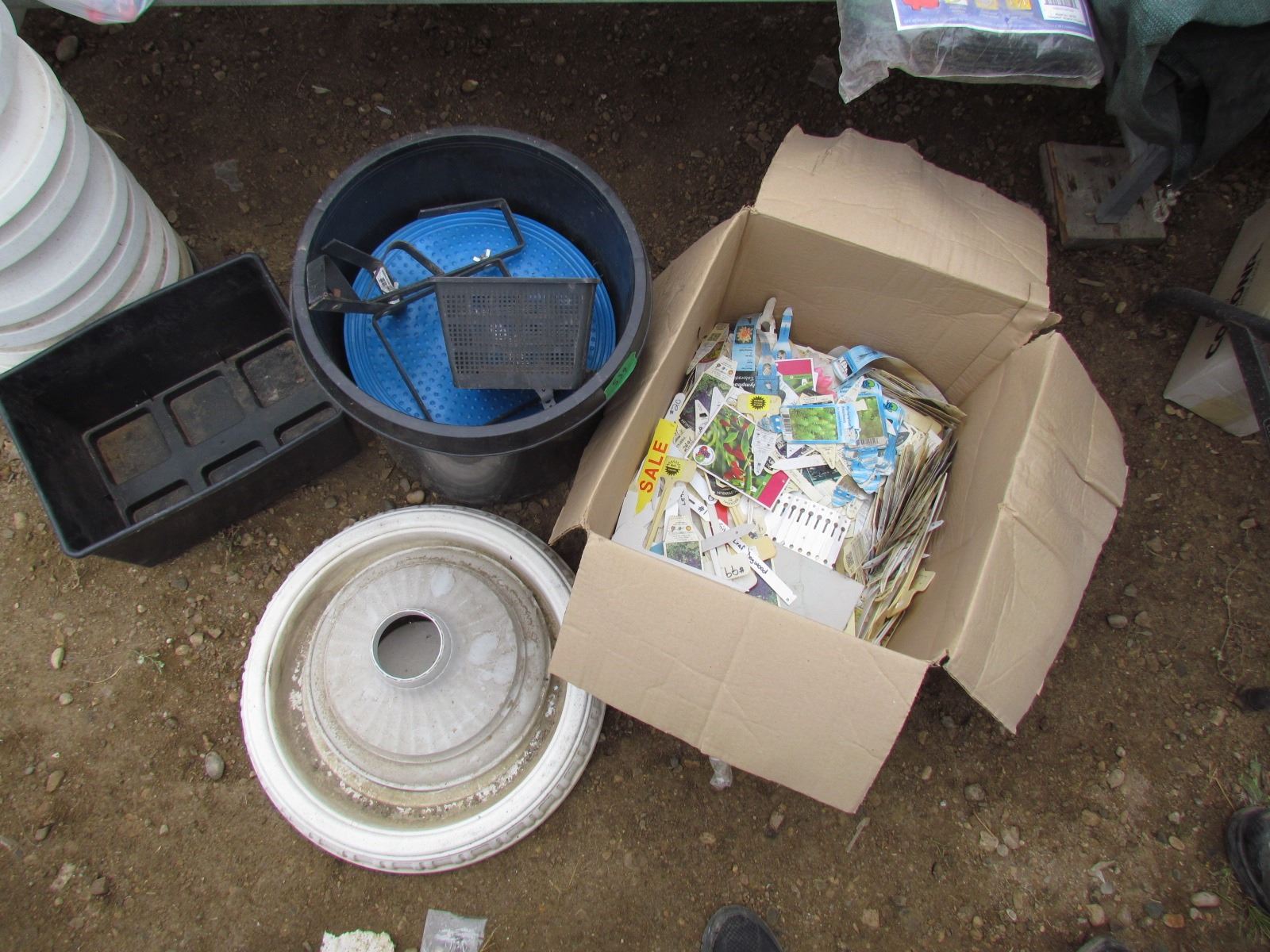 LRG BOX OF BEDDING PLANT TAGS, MISC POTS, ETC