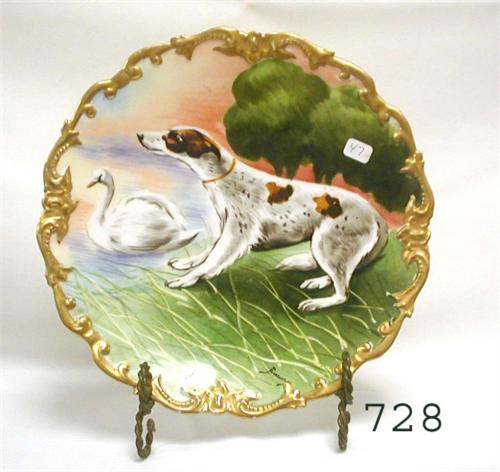 LRL Limoges 10 ¾” game plate with dog and swan – signed P Bararge – heavy gold border