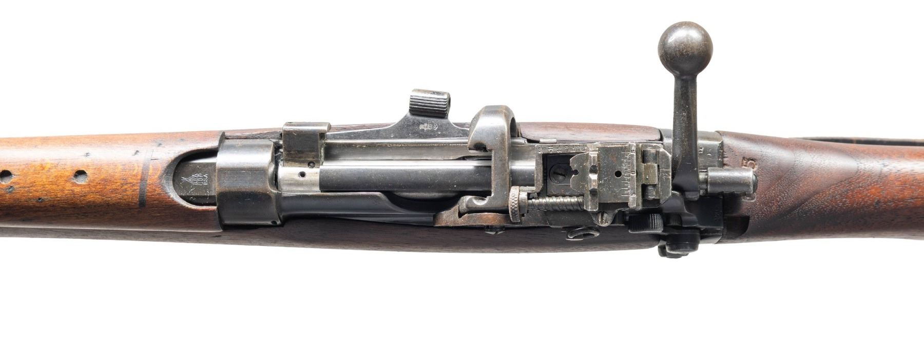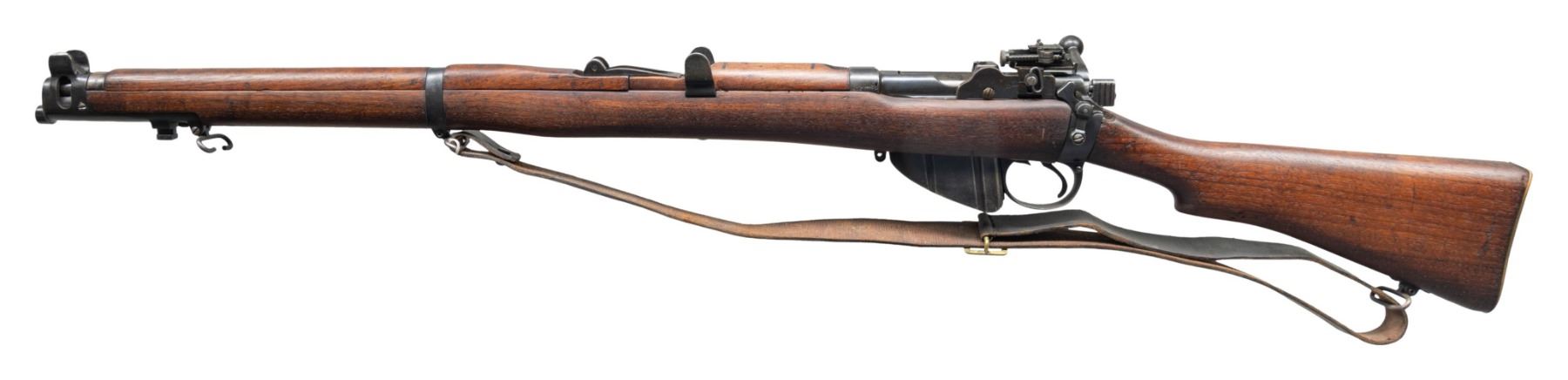 Cal. 22 LR. S# N28710. Bbl. 25 1/5". Blade front sight with protective ears. Harold Cooey (Canadian made) ladder rear sight with broad arrow "C" marking. Matching numbers on receiver, nosecap & bolt handle. Other visible parts appear unnumbered. Right side of receiver has unusual "MADE IN USA" marking possibly an import marking. Right side of socket has LSA Co. markings with 1916 date & "SHT22/IV*" markings. Mag cutoff present. Arsenal blue finish. Hardwood stock set with bottom mounted sling swivels & black leather sling. Top of butt has "325" rack number. MAGS: 1-10 rd. hollowed out for single shot 22 usage. CONDITION: stock set appears cleaned or sanded with a couple thin armorer repaired cracks on handguard ahead of rear sight, some handling marks & dings. Metal retains 40% arsenal rework blue with overall fading to gray, scattered moderate oxidation, edge & handling wear. Action functions properly when hand cycled. Bright near excellent bore. (25-2760/MJC). CURIO. $300-500.