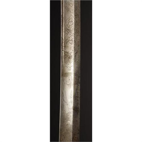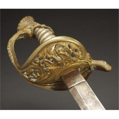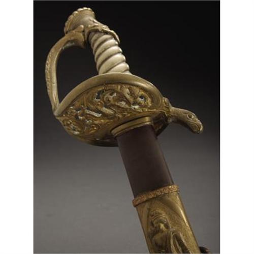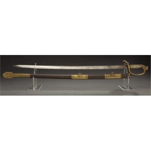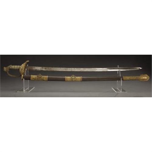 <B>LT. COL. S. E. VARNER COMMANDING VARNER’S BATTALION FROM THE CITIZENS OF ALGIERS ORLEANS PARISH, LA. JULY 3D, 1864</B></I>. The inscription on the back of the top mount of this high grade Tiffany style presentation sword and scabbard reads<B> </B></I><B><I>Lt. Col. S.E. Varner Commanding Varner’s Battalion from the Citizens of Algiers Orleans Parish, LA. July 3D, 1864</B></I></B></I>. Sampson E. Varner was appointed major and mustered in with the 56th Ohio Infantry on November 29, 1861. He was appointed Lt. Col. May 6, 1863. Varner participated with the 56th Ohio in a number of engagements including Arkansas Post, Port Gibson, Vicksburg and the regiments move to New Orleans in August 1863. In February of 1864 Varner was transferred to the 83d Ohio Infantry and placed in command of a battalion, formed from several regiments, in Algiers Orleans Parish, which was designated Varner’s Battalion. He resigned his commission in November 1864 due to illness. Algiers was a suburb of New Orleans and had several shipyards and manufacturing establishments, with an aggregate burthen of 1285 tons in 1861. The sword is of a pattern and quality normally associated with Tiffany & Co. The brass hilt has floral and scroll decoration in the guard with the central motif of a tucked wing eagle with and shield on its breast. Knuckle bow with cast leaf and berry motif and very ornate pommel cap with a spread wing eagle, riband and shield on the face. Eagle head quillon and silver swirled grip. Overall very impressive. The 33” Clauberg Solingen blade is etched for 2/3 of its length employing floral/scroll work, panoplies of arms and the motto “Always Ready” on the obverse. Reverse with floral/scroll work, panoplies of arms, spread wing eagle and fancy intertwined US. The steel scabbard has large, heavy brass mounts with a full standing liberty and shield on the top, arms panoply in the middle and soldier brandishing a sword with an American flag on the bottom, all cast in deep relief. Scroll work on the heavy cast drag. All mounts are also chaised with rococo scroll work. Brass carrying rings. The inscription is on the back of the top mount. A very nice sword of superior quality and workmanship with an unusual inscription.<BR><BR><b>Shipping:</b> Requires 3rd Party Shipping (<a target="_blank" href="http://www.heritageauctions.com/common/shipping.php">view shipping information</a>)