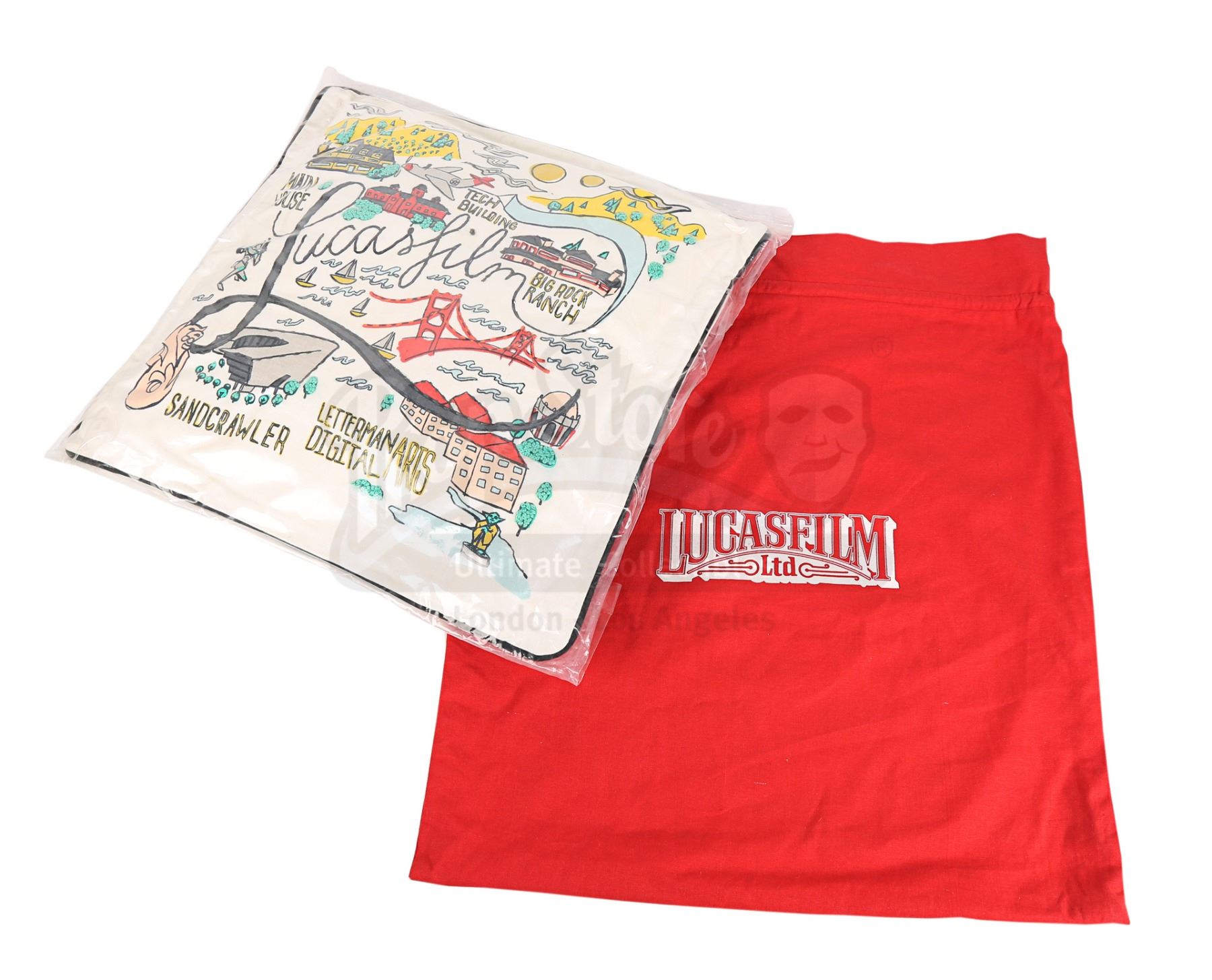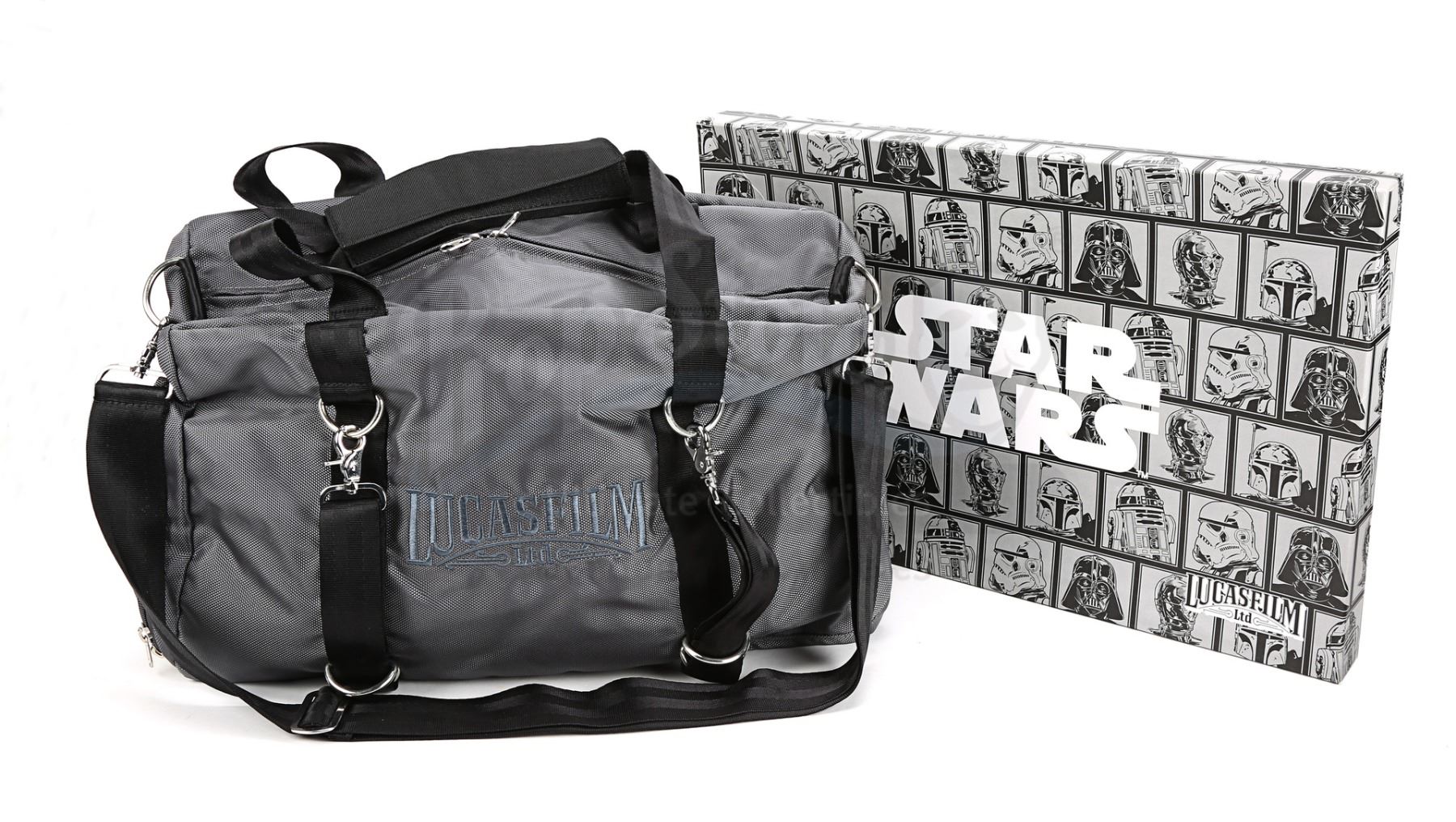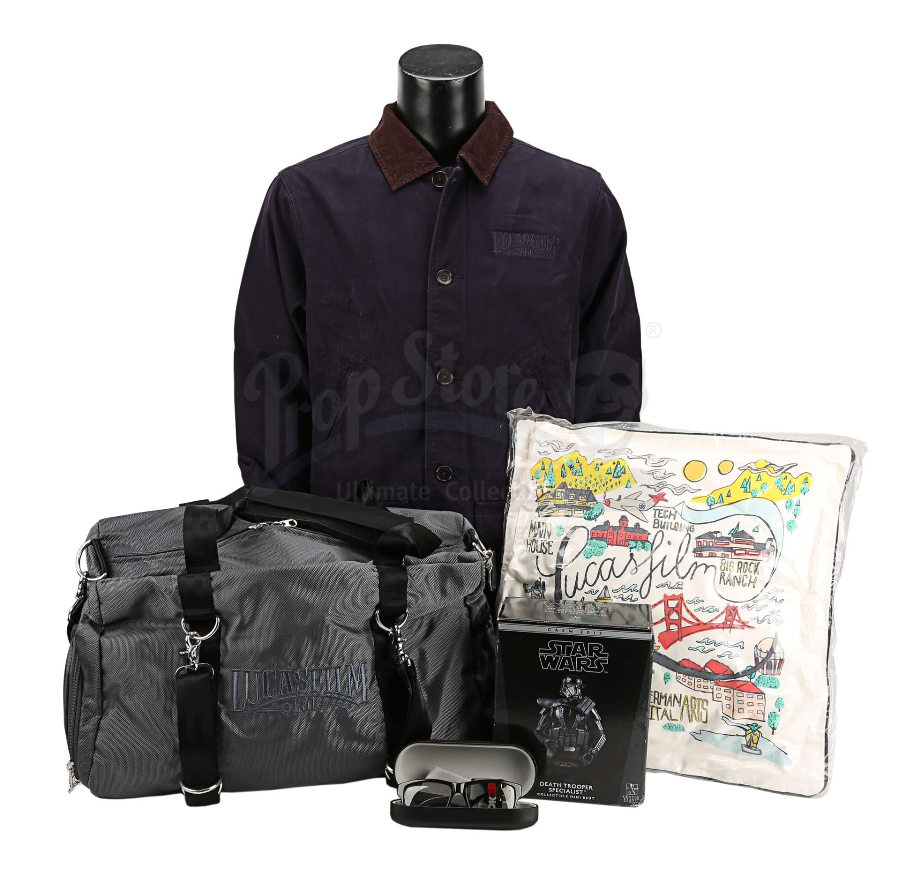 A jacket, pillow, laptop bag, 3D glasses and a Death Trooper mini bust from Lucasfilm, the production company behind the Star Wars franchise. The Land's End jacket is dark blue and labelled size "L". The pillow is hand-stitched and decorated with a map of the Lucasfilm site, and is kept in a protective red drawstring bag. The laptop bag is grey with "Lucasfilm Ltd" embroidered on one side. The 3D glasses come in a black Lucasfilm case within a black card box. The bust is a hand-painted 1:6 scale Death Trooper mini bust, made of polyresin. It comes with a certificate of authenticity and a note from Lucasfilm, thanking a crew member for their work on Rogue One: A Star Wars Story. The items are all in their original packaging and are unused. Dimensions (pillow): 43 cm x 43 cm x 10 cm (17" x 17" x 4"); (bust in box): 10.5 cm x 18 cm x 22 cm (4 1/4" x 7" x 8 3/4"); (laptop bag) 8 cm x 53 cm x 34 cm (3 1/4" x 21" x 13 1/2"); (3D glasses box): 8.5 cm x 18 cm x 6 cm (3 1/4" x 7" x 2 1/2")