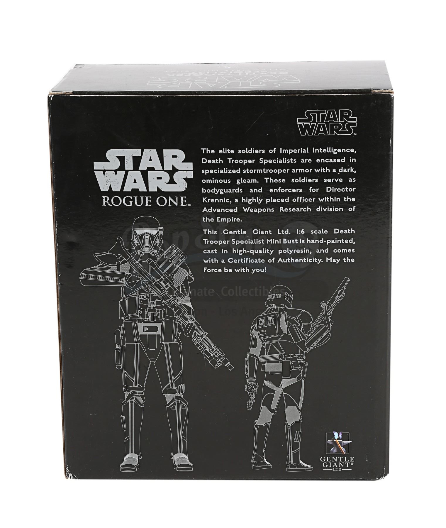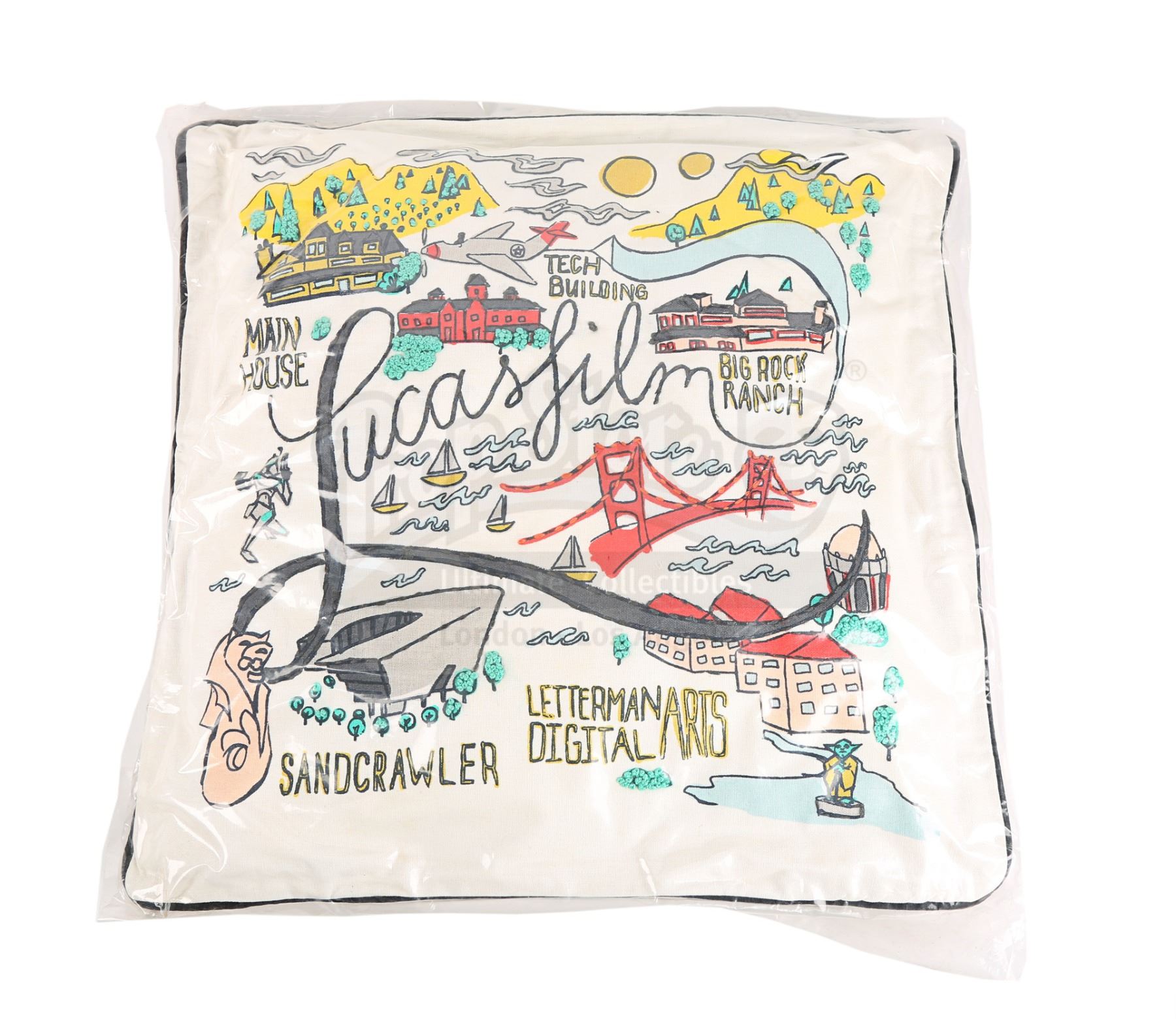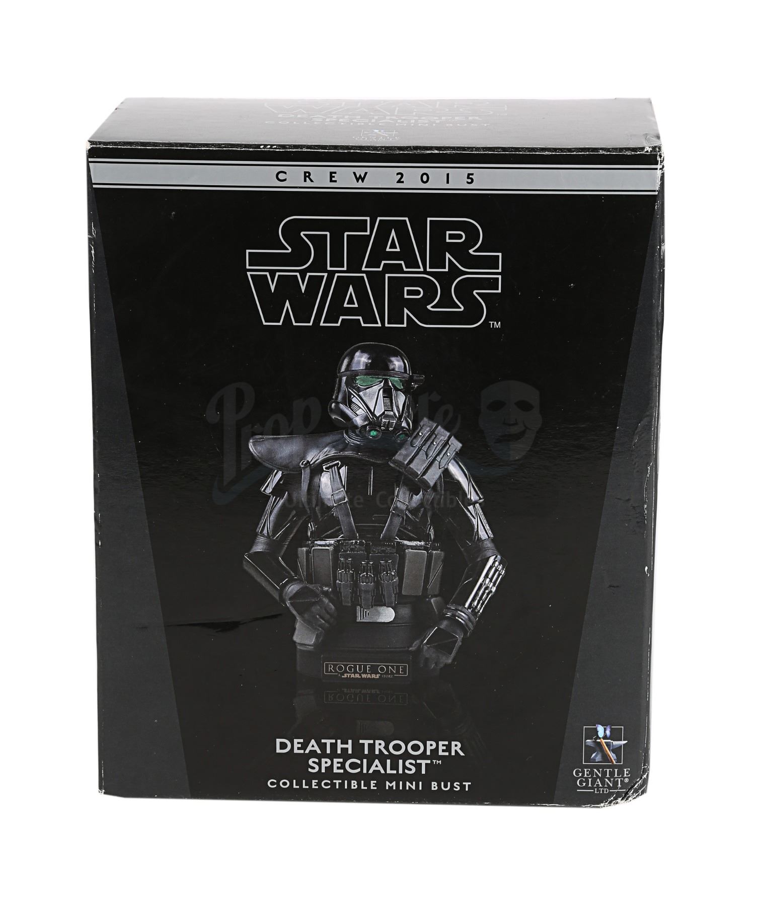A jacket, pillow, laptop bag, 3D glasses and a Death Trooper mini bust from Lucasfilm, the production company behind the Star Wars franchise. The Land's End jacket is dark blue and labelled size "L". The pillow is hand-stitched and decorated with a map of the Lucasfilm site, and is kept in a protective red drawstring bag. The laptop bag is grey with "Lucasfilm Ltd" embroidered on one side. The 3D glasses come in a black Lucasfilm case within a black card box. The bust is a hand-painted 1:6 scale Death Trooper mini bust, made of polyresin. It comes with a certificate of authenticity and a note from Lucasfilm, thanking a crew member for their work on Rogue One: A Star Wars Story. The items are all in their original packaging and are unused. Dimensions (pillow): 43 cm x 43 cm x 10 cm (17" x 17" x 4"); (bust in box): 10.5 cm x 18 cm x 22 cm (4 1/4" x 7" x 8 3/4"); (laptop bag) 8 cm x 53 cm x 34 cm (3 1/4" x 21" x 13 1/2"); (3D glasses box): 8.5 cm x 18 cm x 6 cm (3 1/4" x 7" x 2 1/2")