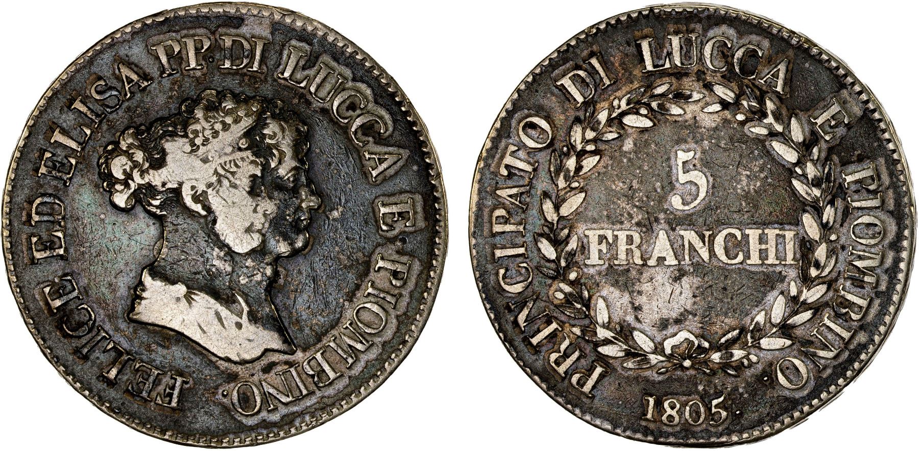 LUCCA: Felix Bacciocchi and Elisa Bonaparte, 1805-1814, AR 5 franchi, 1805, Fine